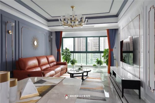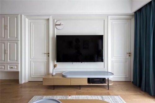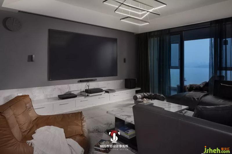 100寸的激光電視配上高端環(huán)繞式音響,將看電影,玩游戲的體驗(yàn)感達(dá)到了極致。電視下面是整排的儲(chǔ)物抽屜,白色大理石貼面,代替了限長的電視柜,與較大的電視屏幕比例更加協(xié)調(diào)。整體顏色上面也有提亮的作用,讓空間的層次感更強(qiáng)。