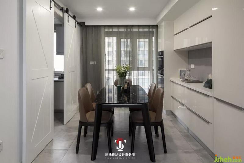白色的餐邊柜使餐廳有足夠的收納空間,同時(shí)嵌入式的烤箱和蒸箱節(jié)省了廚房的空間也方便西廚的使用。白色的谷倉門在油煙大時(shí)可以關(guān)上,平時(shí)打開不僅美觀,也使得空間更寬闊。
