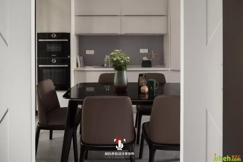 “滿紙沉墨,一笑若白,輕啟紅唇,溫存余久”與客廳大面積灰不同的是,餐廳區(qū)域以白色為主,顏色上對空間就已經(jīng)進(jìn)行了劃分,在這樣的空間中同樣能看到各種顏色與材質(zhì)的交織。