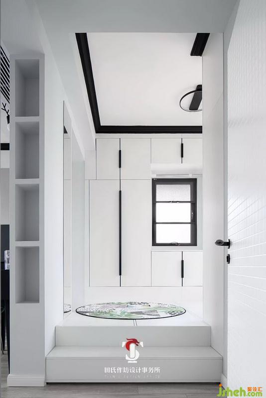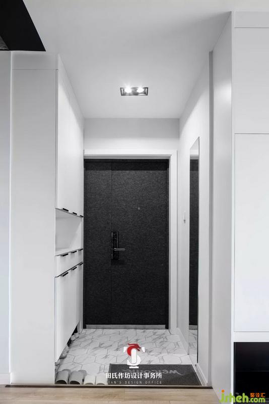 入戶位置以下沉式的玄關做了分區(qū),非常推薦這種上頂天,下不落地的玄關鞋柜,日常生活進家脫鞋臨時放在最下面的空間,方便也整潔。簡單的黑與白,光面與磨砂,質感十足。