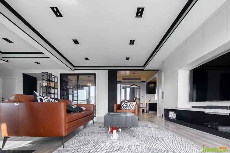 室內設計師在客廳的頂面采用了黑色線條的形式弱化了梁與吊頂之間的落差,整體以黑色線條加黑色色塊的方式分隔區(qū)域,而皮質的沙發(fā),黑色的鋼架結構透露出工業(yè)風的氣息。
