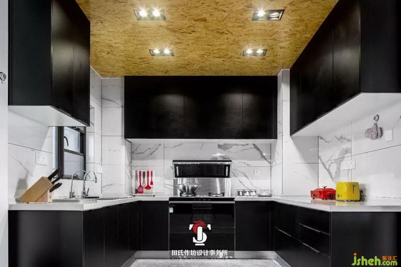 室內設計師在廚房選擇了開放式的,這樣可以讓整個餐廚空間看起來更加寬敞,U型的操作臺面足夠家中所有的電器擺放。由于客廳的選用了大面積的黑色色塊,櫥柜這里選擇了清一色的黑,使得整體風格與客廳更加呼應,為避免色彩太過壓抑,墻磚選擇了有灰色花紋的白磚。