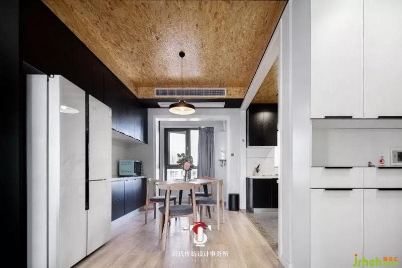 餐廳和廚房都采用了obs板吊頂,增強了整個空間的工業(yè)感,廚房也不再用傳統(tǒng)的扣板燈,以斗膽燈的形式更加現(xiàn)代美觀,餐廳的小陽臺也納入了餐廳的空間,每一寸空間都不浪費。雙開門的大冰箱以內嵌形式更加美觀,餐邊柜也選用了和廚房一樣的顏色,臺面上足夠擺放日常的物品。