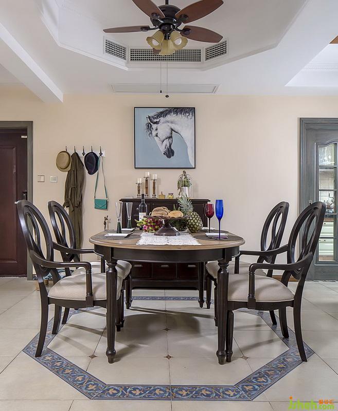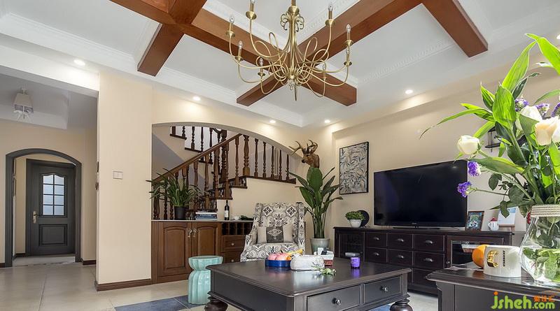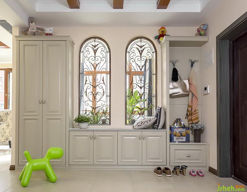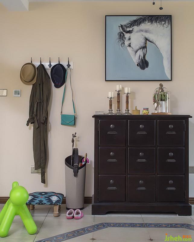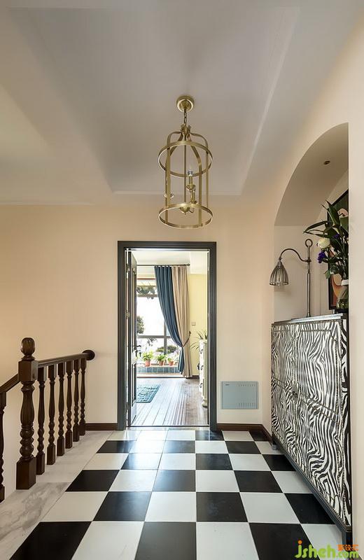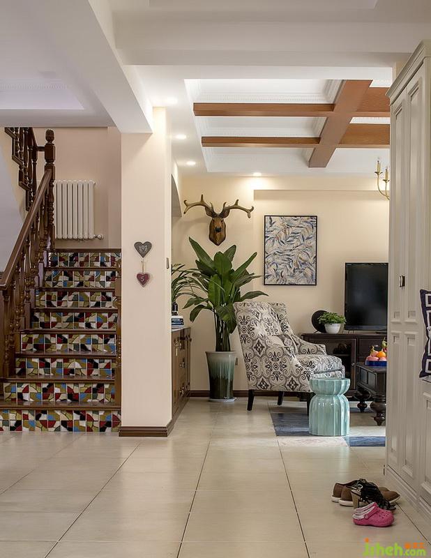 進(jìn)門(mén)高中低三類鞋柜,巨大的收納空間使得各類鞋子剛好的放置,從鐵藝窗花投過(guò)來(lái)的光顯得更亮通風(fēng)也更好。進(jìn)門(mén)看到樓梯處花瓷磚是一個(gè)設(shè)計(jì)上的小心思,沙發(fā)若隱若現(xiàn),動(dòng)線改變?nèi)サ娇蛷d處,顯得空間更富有層次感。角落里的小壁爐,圣誕節(jié)的禮物藏在里面,想必也是滿滿的童趣吧??蛷d各種質(zhì)感沙發(fā)的搭配均衡而不凌亂,藍(lán)色的鼓凳和墻上飾品的相呼應(yīng)使得整個(gè)空間和諧美。