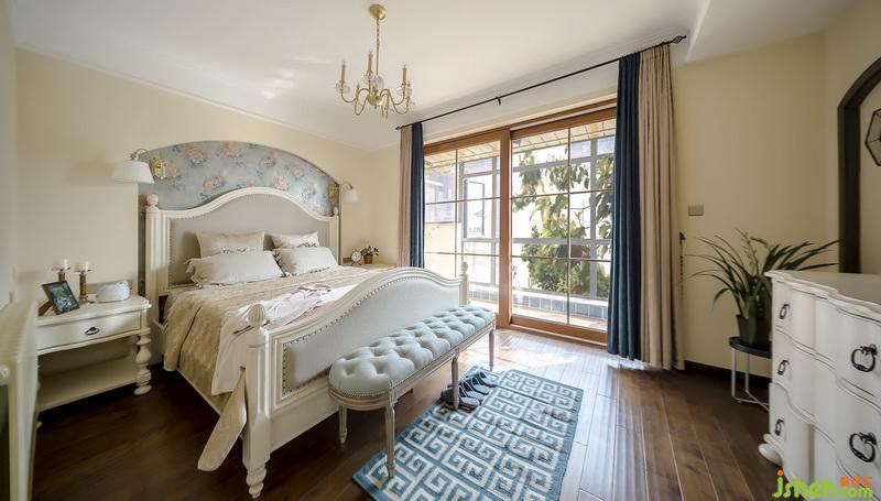 主臥的床沒有床尾凳配,是設計公司自己配的,等了一個多月才到貨。寬大的落地門落地窗,抬眼就是窗外的美景,開敞通透。