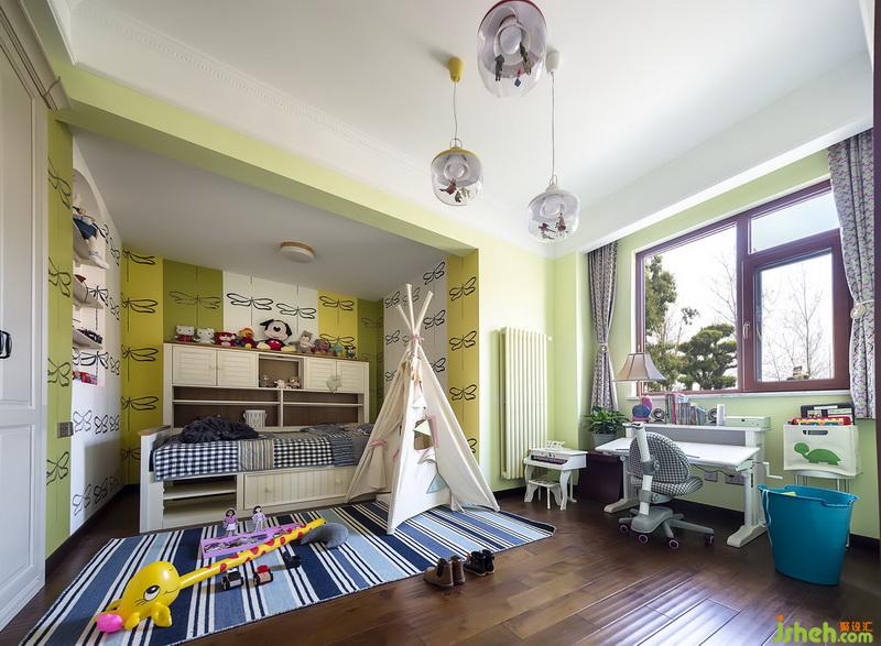 小朋友的房間,就是一派春天的樣子,有生機有活力。墻紙選了同款的幾個不同的顏色 ,混拼起來的。燈里面還塞了一些小玩具進去,有童趣。