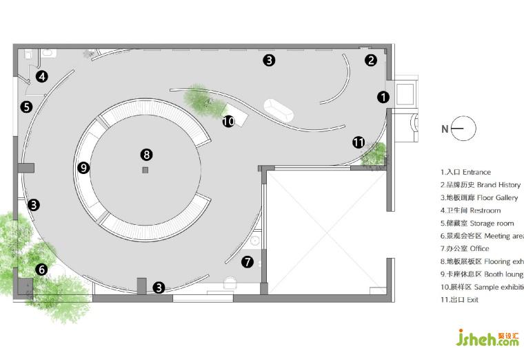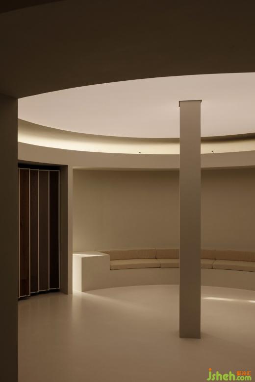 受到北京天壇祈年殿的啟發(fā),設(shè)計師在原本矩形的空間內(nèi)部置入了一個圓筒形結(jié)構(gòu),圍繞這個體量,空間被簡潔的切分為了“內(nèi)圓外方”的空間格局。