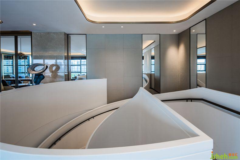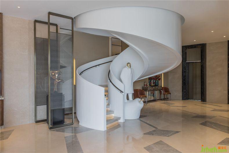 酒店設(shè)計(jì)整個(gè)設(shè)計(jì)圍繞純白色旋轉(zhuǎn)樓梯展開,它宛若女性的曼妙身姿,作為縱向通道將兩層空間聯(lián)系起來,向外延升整個(gè)空間。純手工站立雕塑以留白方式給人更多想像的空間。