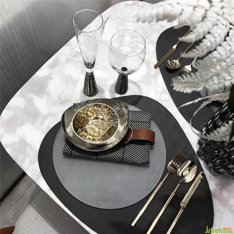 開放式餐廳與吧臺劃分出空間感,打破傳統(tǒng)封閉的格局,讓空間連接成共同體,帶來寬闊而明亮的整體美感,干練的燈具線條豐富了格調和層次,桌椅的顏色搭配與空間保持整體統(tǒng)一的色調,偶有淡淡花香沁入心脾。金屬餐具與自然紋理的大理石形成對比,贈予空間一絲浪漫和儀式感。