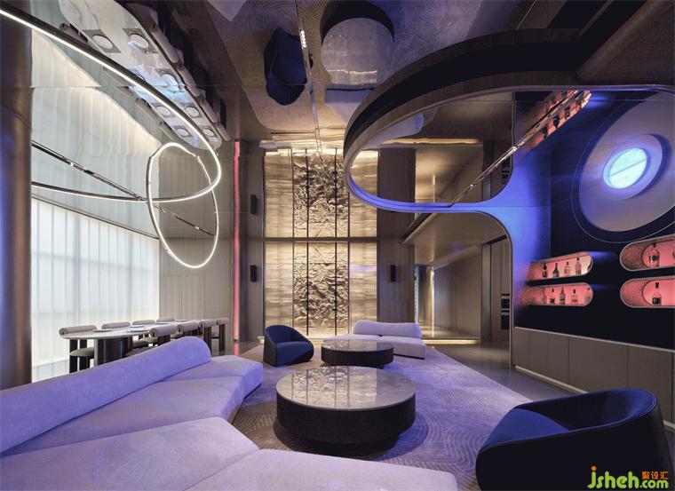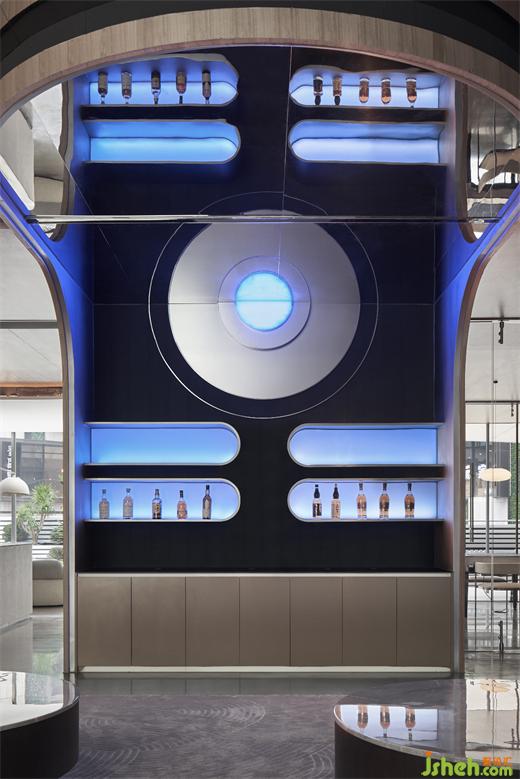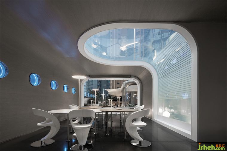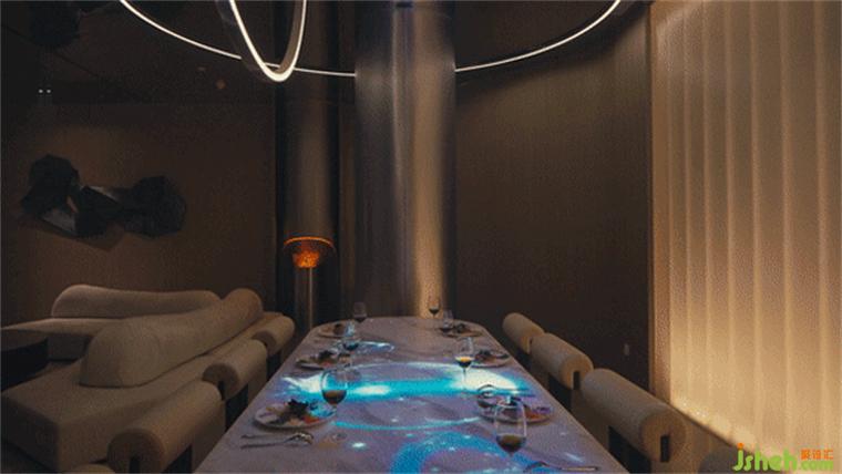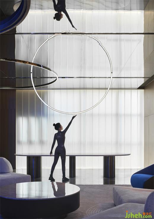 側(cè)面玻璃墻呈現(xiàn)出“天圓地方”的傳統(tǒng)宇宙觀,黑色石材地面,通過光的反射和投影,營造出如同大地的深邃效果。會所設(shè)計打破傳統(tǒng)的家具形式,設(shè)計師以行星散布的形式設(shè)計了多功能廳的桌面??梢苿拥淖酪稳缤行堑倪\行,讓空間的功能通過家具的變化而多變,可會議、可娛樂,為消費者帶來與眾不同的感受和體驗。
