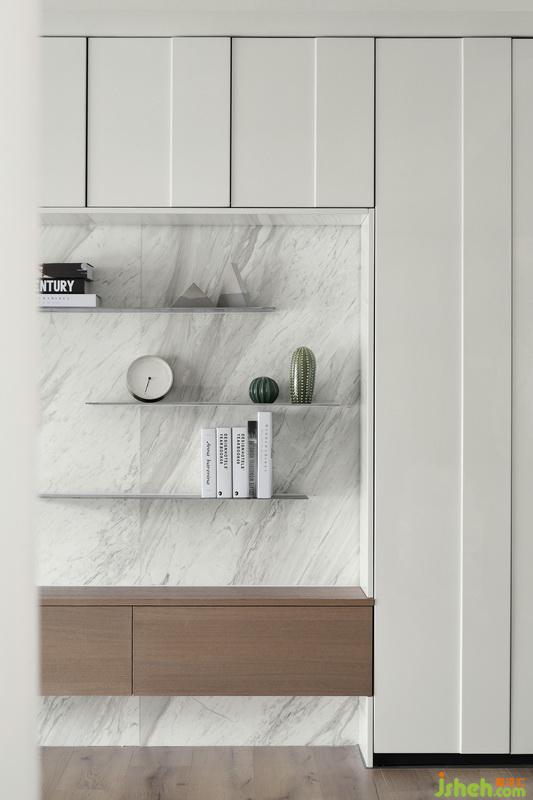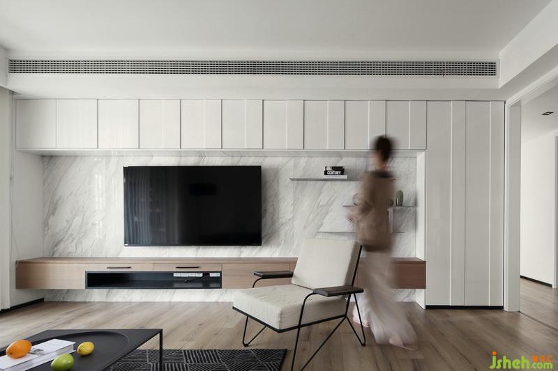 ▲電視背景采用定制的造型烤漆柜門結(jié)合鋼板和大理石,白凈的基底搭配富有層次感的大理石紋路,簡約清爽中帶來時尚與質(zhì)感,結(jié)合木質(zhì)帶來自然舒適的視覺感受,加長的空調(diào)風(fēng)口,則很好的擴大了視覺效果。