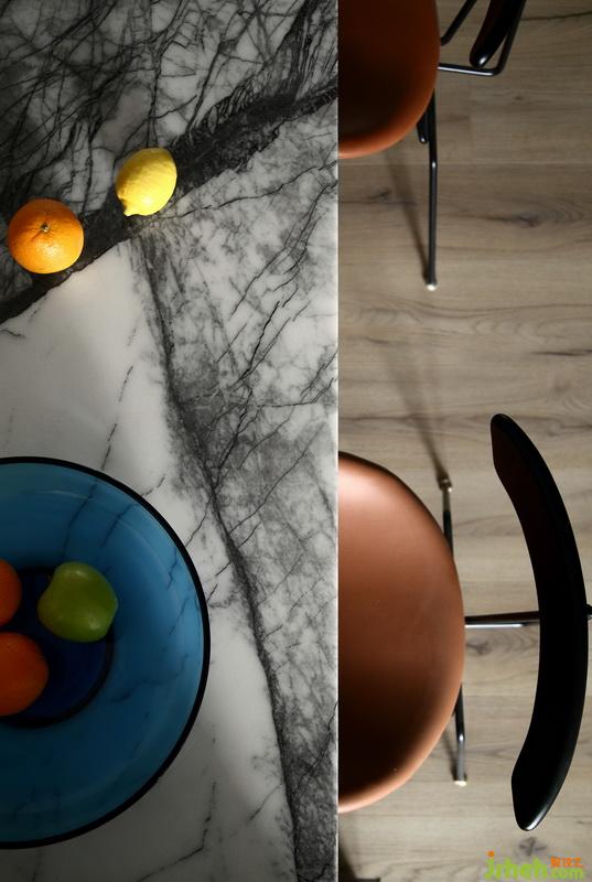 ▲開(kāi)放式的布局令窗外的綠意美景與光線盡情的穿行室內(nèi),線條利落的大理石餐桌與造型時(shí)尚的餐椅,打造出簡(jiǎn)約卻不簡(jiǎn)單的用餐環(huán)境。不論是煥發(fā)著生機(jī)的綠植還是超個(gè)性的發(fā)光雕刻鋼板,在這里都被不斷的放大,讓動(dòng)與靜、明與暗、冷與暖達(dá)到平衡。