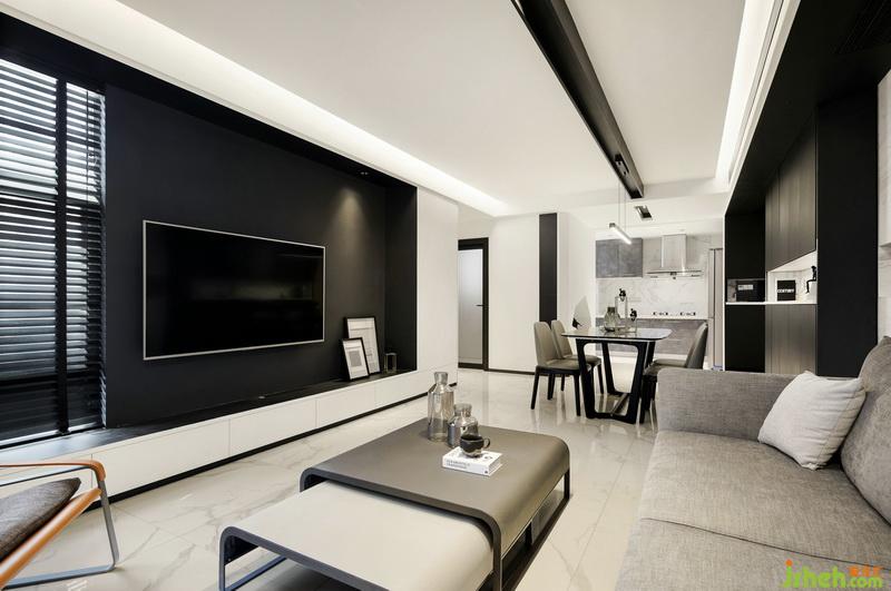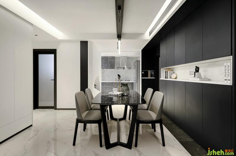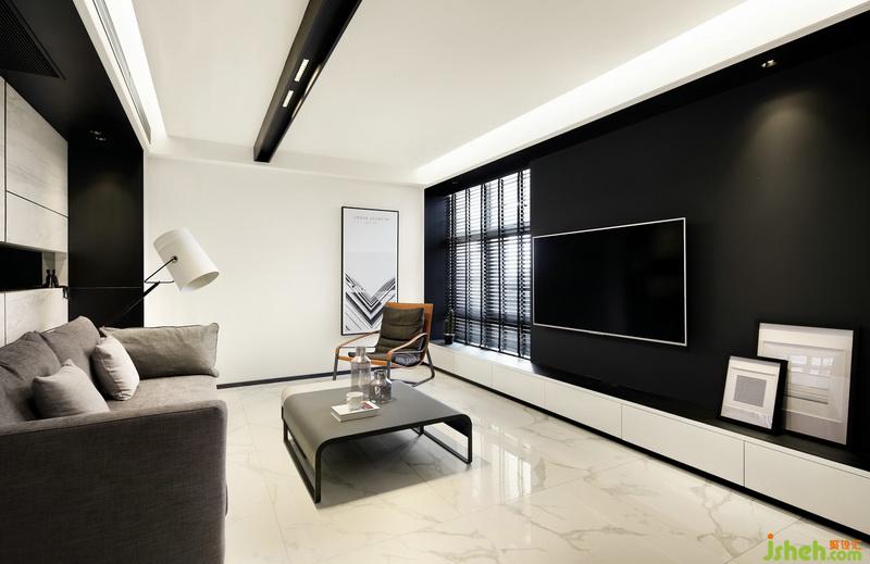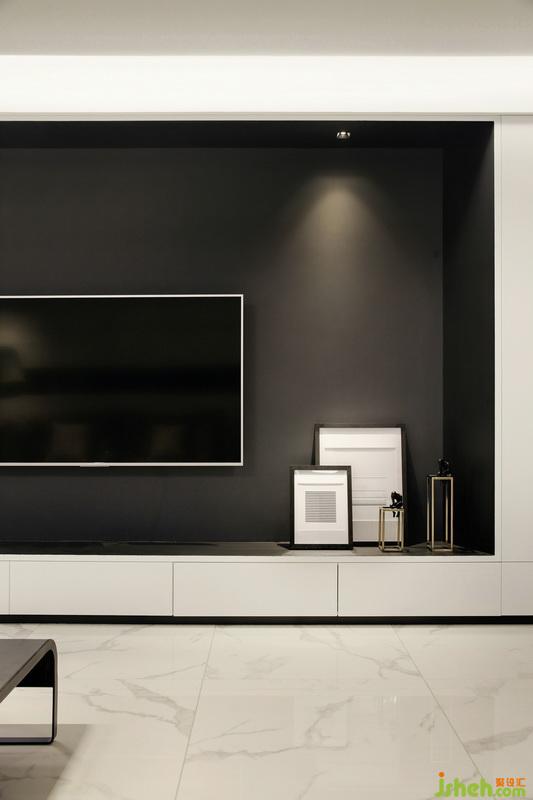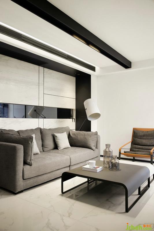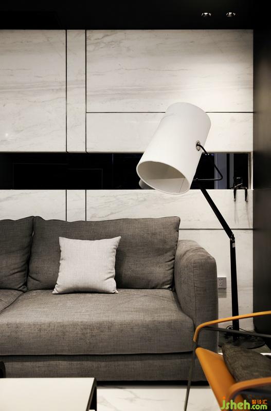 ▲在這個黑白簡約的精致空間里,每個單品的選擇都是質(zhì)感且時髦。沙發(fā)背景墻選用大理石鋪貼,而中間鏤空部分則貼鏡面,拉伸視覺感的同時使空間更加通透。地磚與背景墻相呼應(yīng),紋理如同行云流水的藝術(shù)畫,氣質(zhì)凜然。