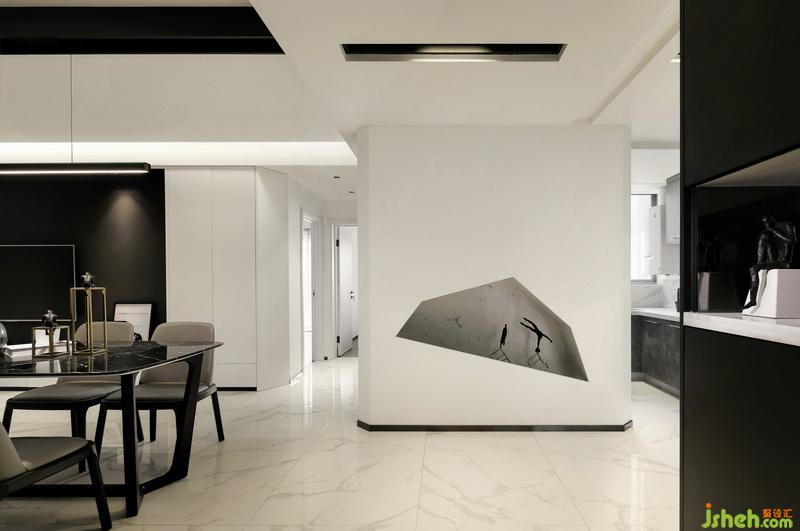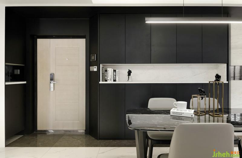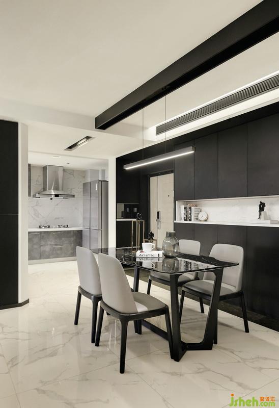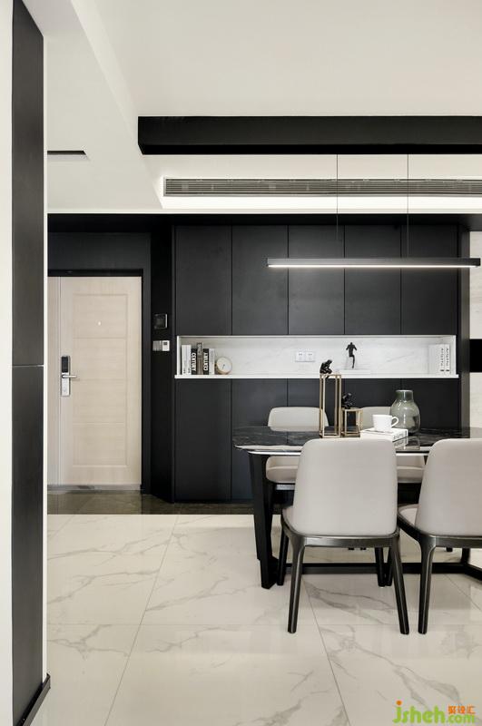 ▲開放式的布局讓室內(nèi)更加通透明亮,各個功能區(qū)的聯(lián)系也顯得更加緊密。定制的整面餐邊儲物柜滿足了儲物需求,結(jié)合造型簡潔而優(yōu)雅的皮革餐椅搭配大理石餐桌,提升了整個空間的質(zhì)感。為了使空間動線流暢,室內(nèi)設(shè)計(jì)師將定制柜都做了切角處理,避免磕碰而又具有設(shè)計(jì)感。