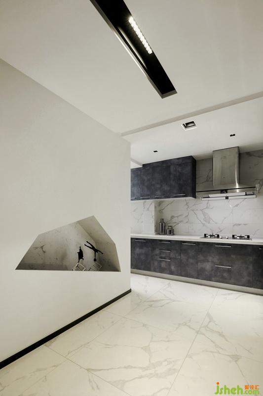 ▲從入戶門向?qū)γ嫱ィ遣蛷d與廚房的轉(zhuǎn)折處,經(jīng)過廚房的墻面,室內(nèi)設(shè)計(jì)師趣味性的在墻面上“開洞”,內(nèi)貼大理石,放置的小擺件也是趣味十足。