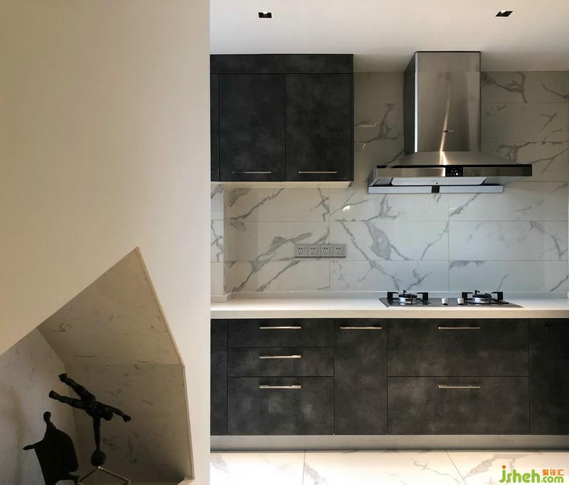 ▲室內(nèi)設(shè)計(jì)師為了使空間更為通透、寬敞,打掉了原戶型的廚房墻體,定制的櫥柜在顏色運(yùn)用上搭配整體空間,開放式廚房在布局上和諧統(tǒng)一,延伸視覺感。