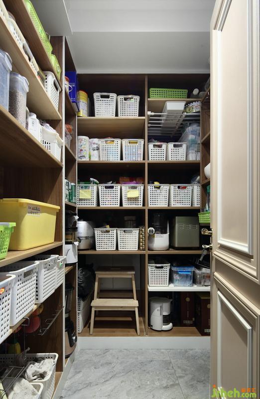 ▲收納間以轉(zhuǎn)折的儲(chǔ)物架來(lái)最大化滿足這個(gè)區(qū)域的使用功能性,其中層板的分配可以根據(jù)具體物品的擺放來(lái)規(guī)劃。