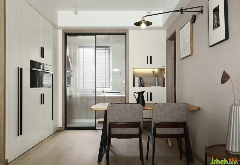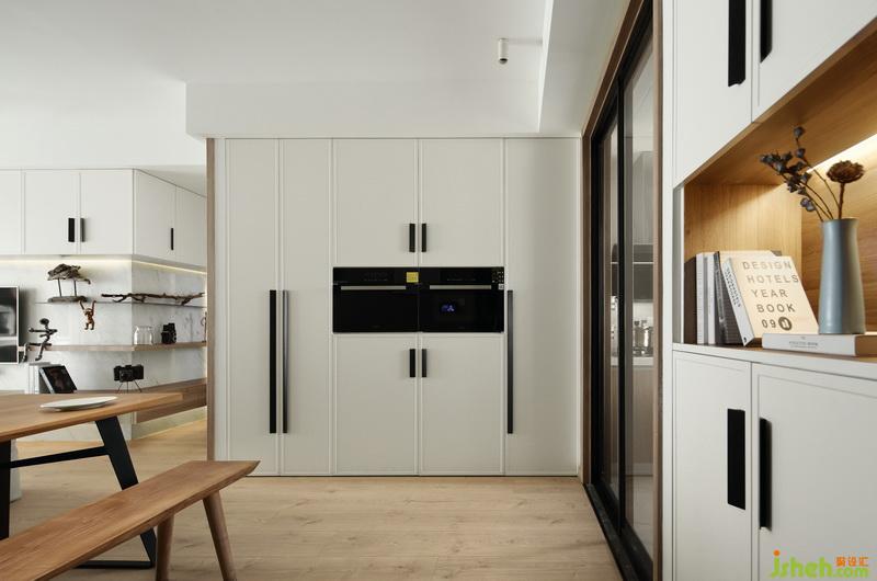 ▲迎面玄關的是定制的西廚高柜,用于嵌入式電器外也是收納儲物的好地方。為了符合生活需求,入戶處增加了鞋柜設計,鞋柜中間做開放設計也是為了避免柜體過于厚重,使入戶看起來擁堵,也可作為平時隨手放小物件的區(qū)域。廚房區(qū)域與餐廳區(qū)域息息相關,而廚房移門的加入便使餐廳具有光亮通透感,同時開闊了廚房空間。