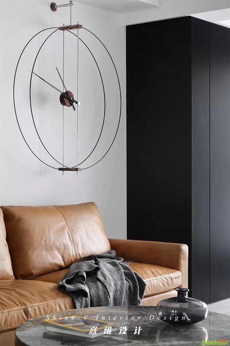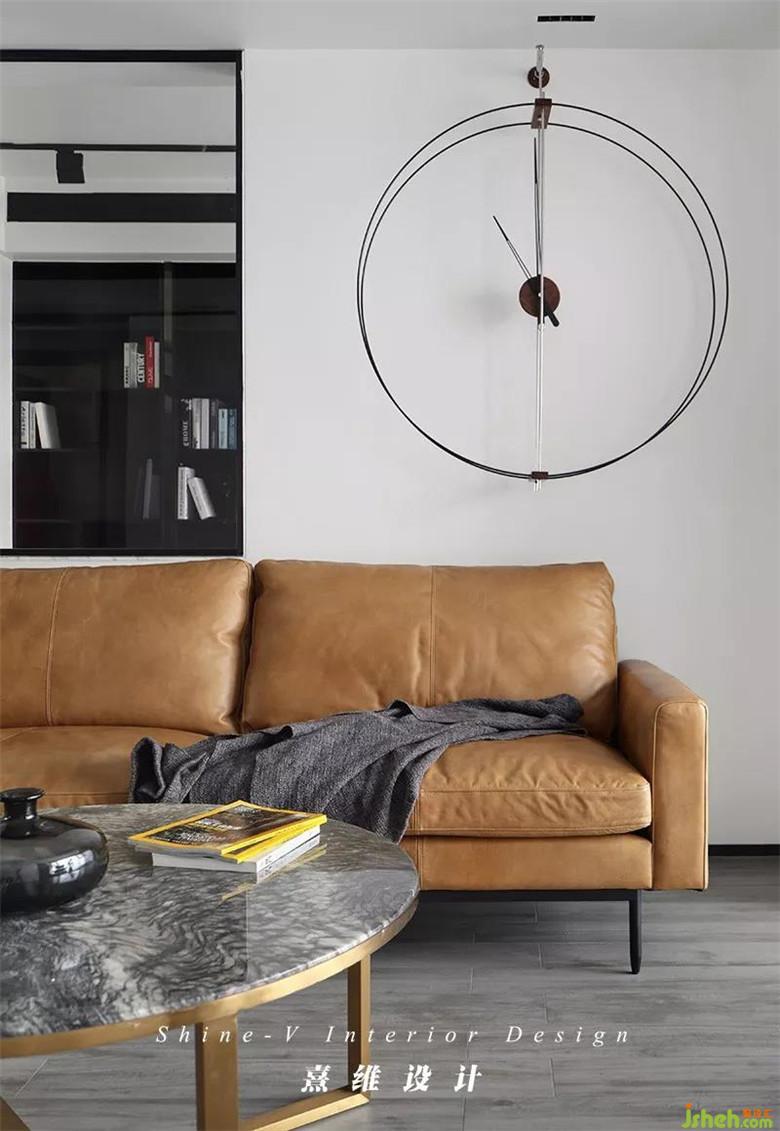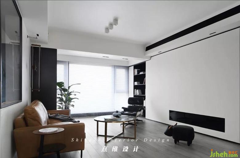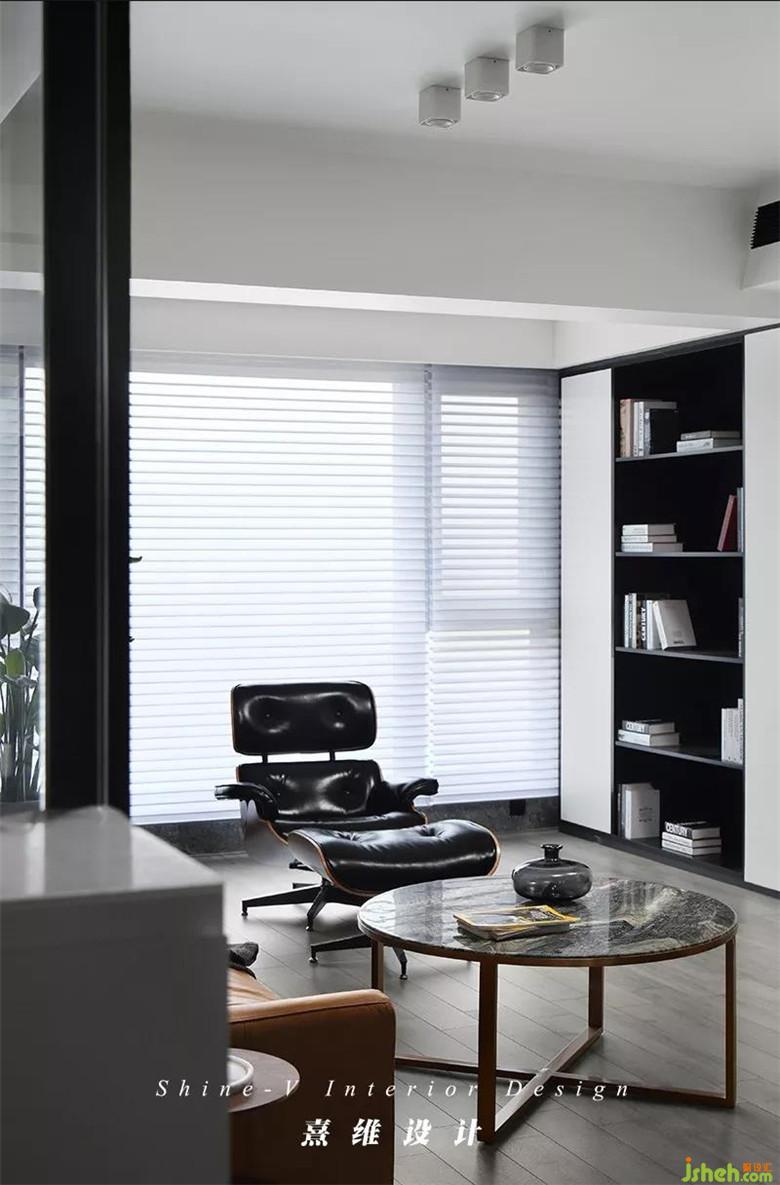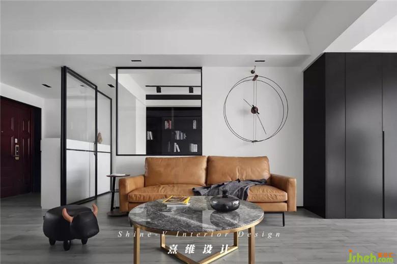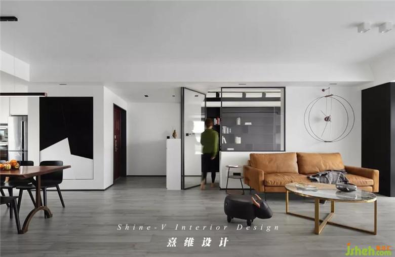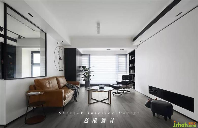 ▲以黑白灰色為空間基調(diào)——入戶便能感受到整個(gè)空間濃郁的簡約現(xiàn)代風(fēng),其中沙發(fā)作為客廳中的主體家具,以暖色調(diào)棕色進(jìn)行點(diǎn)綴、中和。沙發(fā)后便是書房,室內(nèi)設(shè)計(jì)師通過玻璃隔斷的處理方法保證了室內(nèi)的采光,光線的暈染下,家具更有質(zhì)感,織品更加舒適,黑色與棕色也避免了沉悶。