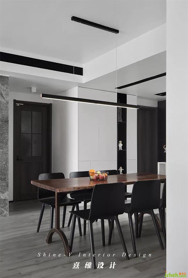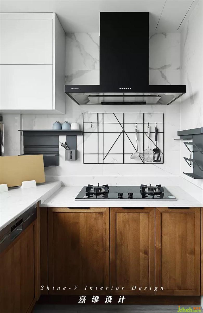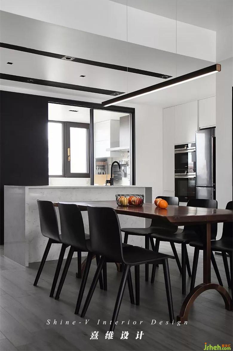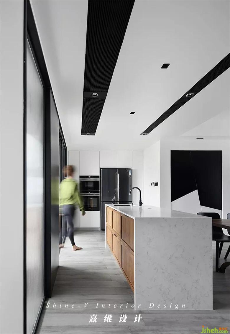 ▲西廚區(qū)在黑白灰主色調(diào)的基礎(chǔ)上柔和了木色,讓整個(gè)空間調(diào)和的更具溫度。黑色的加長風(fēng)口和嵌入式射燈也讓空間頂面設(shè)計(jì)更加出彩,燈光與整體空間的氛圍營造密不可分!