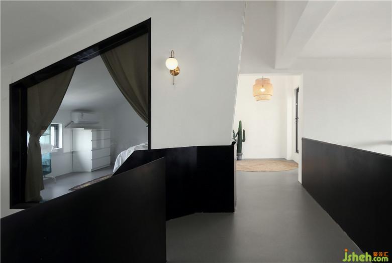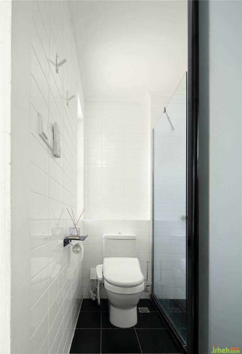 ▲干區(qū)簡(jiǎn)白臺(tái)盆+原木臺(tái)面的組合與整個(gè)空間氛圍完美契合,即便是管道外露無(wú)遮蔽,也是為這個(gè)空間增添了一抹迷人的工業(yè)風(fēng)FEEL。洗浴室融入了更多的現(xiàn)代氣息,磨砂玻璃移門(mén),黑色軌道外露與整體空間融合且富有質(zhì)感。