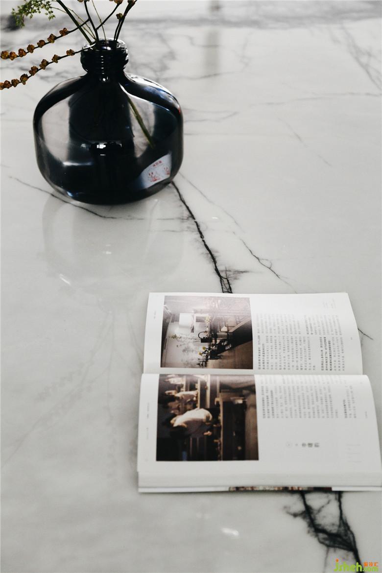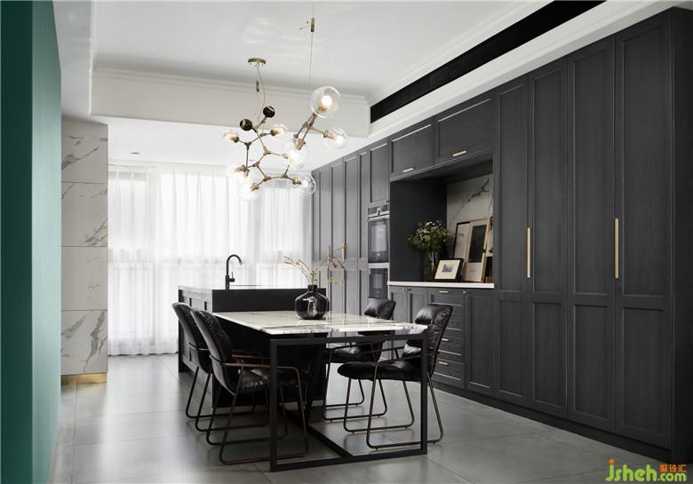餐廳比較長,nordst的大理石餐桌和全屋的石材質(zhì)感墻磚相匹配。加長的分子吊燈從視覺上延伸了餐廳的空間。