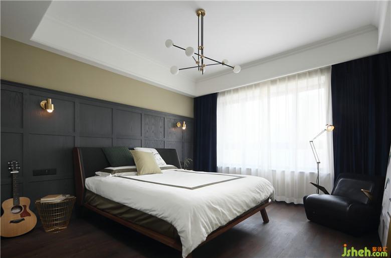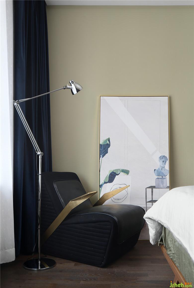 主臥的背景墻設(shè)計依舊延續(xù)了客餐廳的灰色設(shè)計元素,使用高位的護墻板以達(dá)成整體的風(fēng)格統(tǒng)一性,深色的窗簾可以增加睡眠的舒適度。角落的單人沙發(fā)搭配宜家的落地?zé)?,成為了屋主最愛的閱讀角。