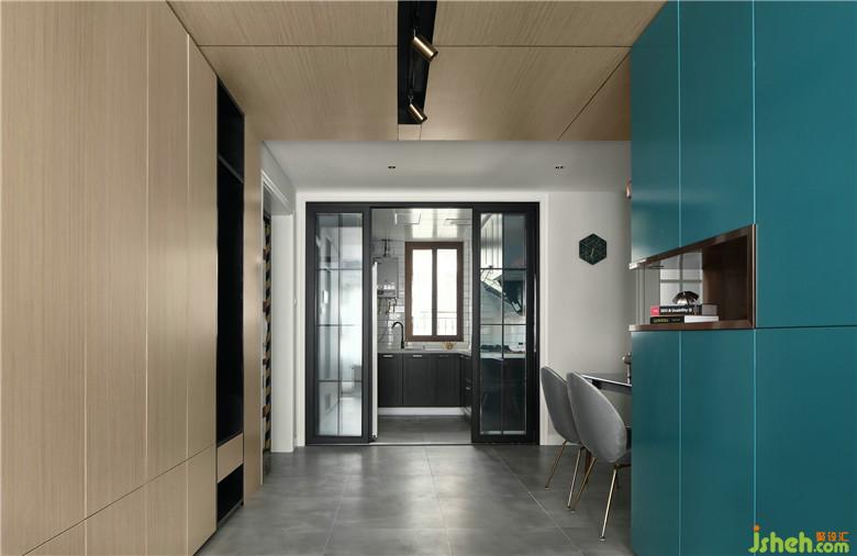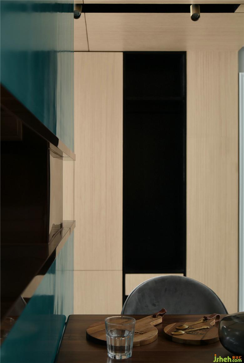 ▲室內設計師將原戶型廚房不必要的隔墻進行拆除,以定制的黑框玻璃移門增加空間的采光及通透感。廚房空間用色層次分明,以最為經典的黑、白、灰三色營造出空間的利落清爽。