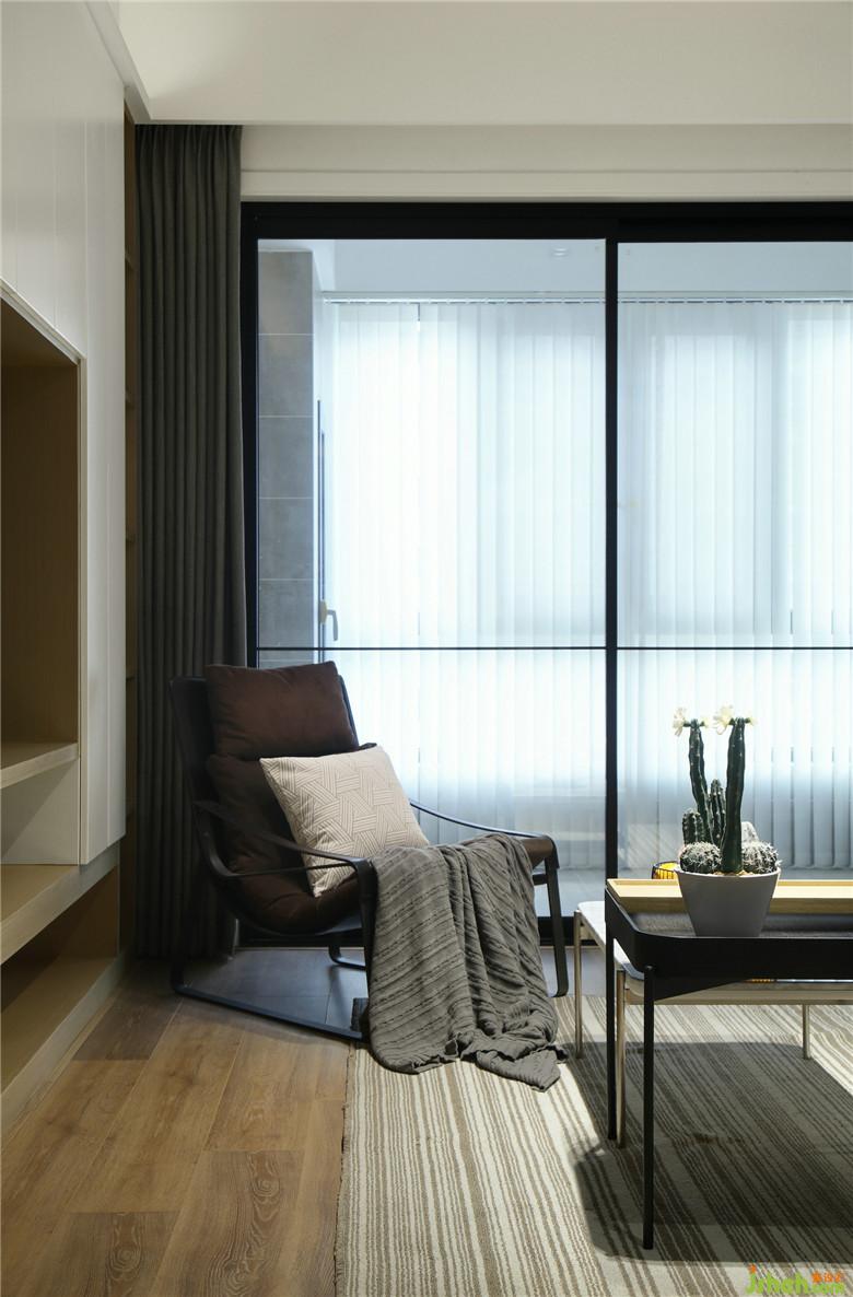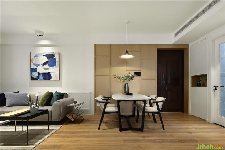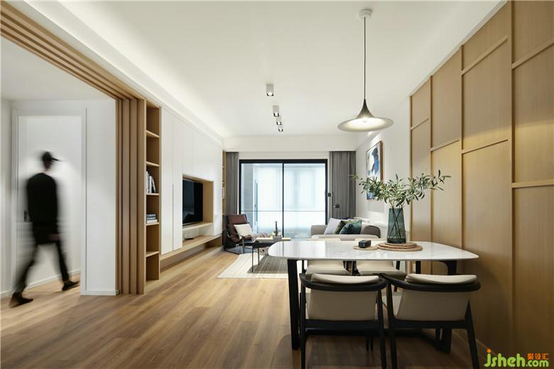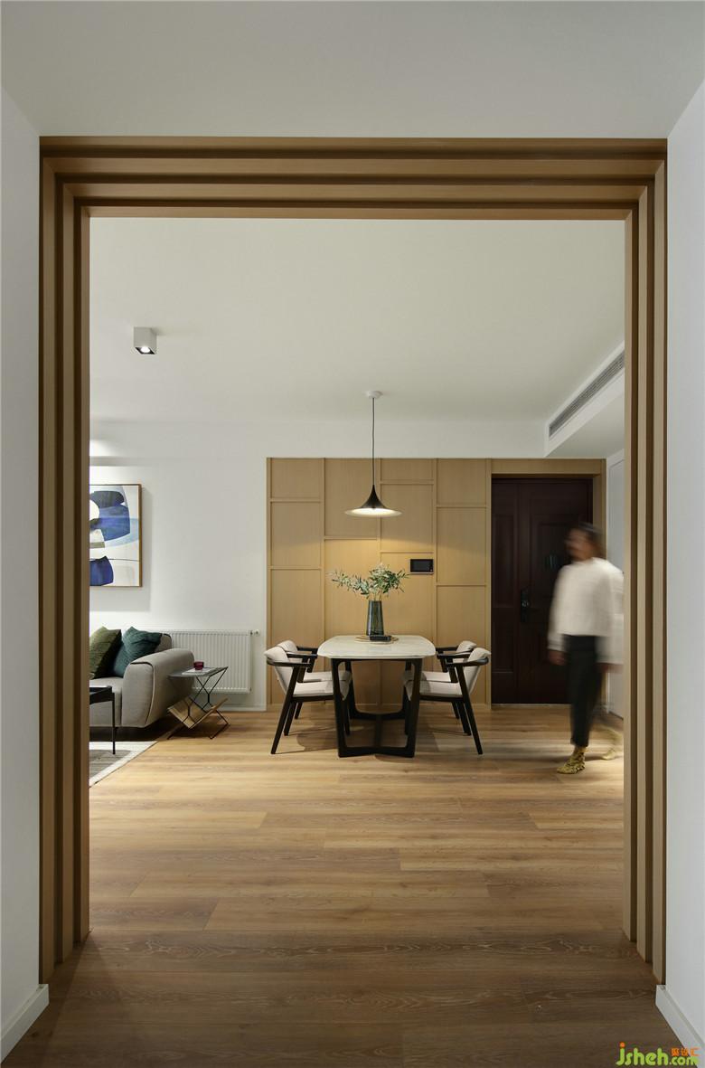 ▲本案整體空間內(nèi)部采用了許多的自然元素,色彩盡量的簡化,入戶左手邊結(jié)合墻體增加鞋柜,白與木色的定制鞋柜搭配著溫暖的燈光,營造出溫暖而利落的視覺感受。