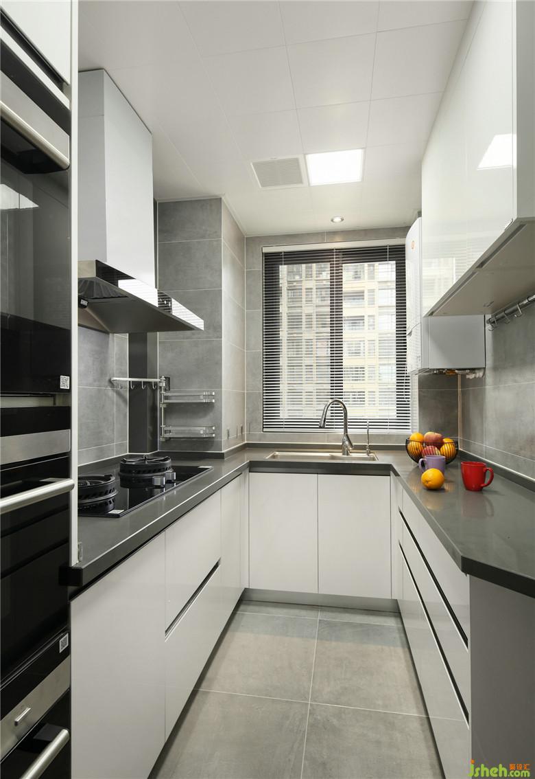 ▲廚房空間用色層次分明,以最為經(jīng)典的黑、白、灰三色營造出空間的利落清爽。為了避免櫥柜邊角的磕碰,室內(nèi)設(shè)計師做了緩沖的轉(zhuǎn)角設(shè)計,讓行走動線更流暢。
