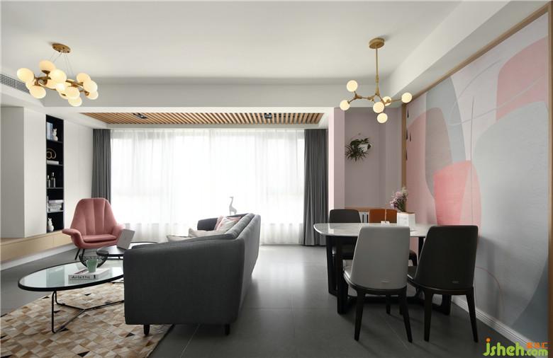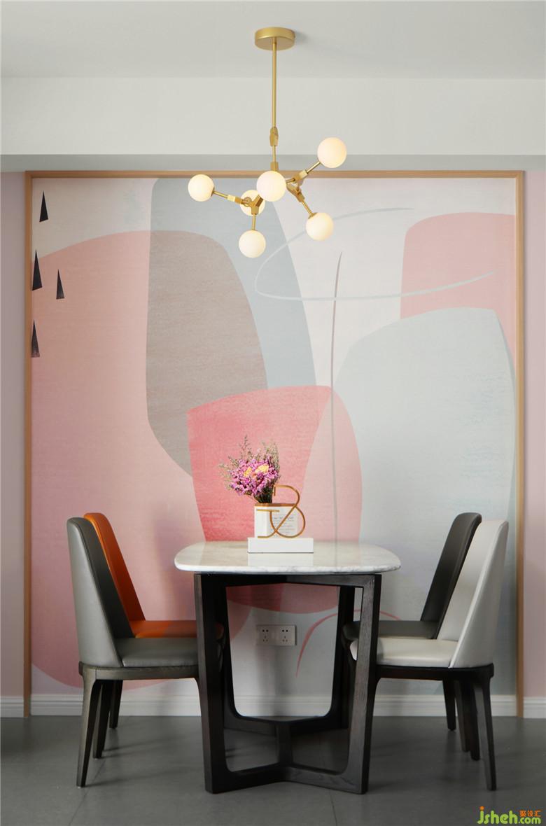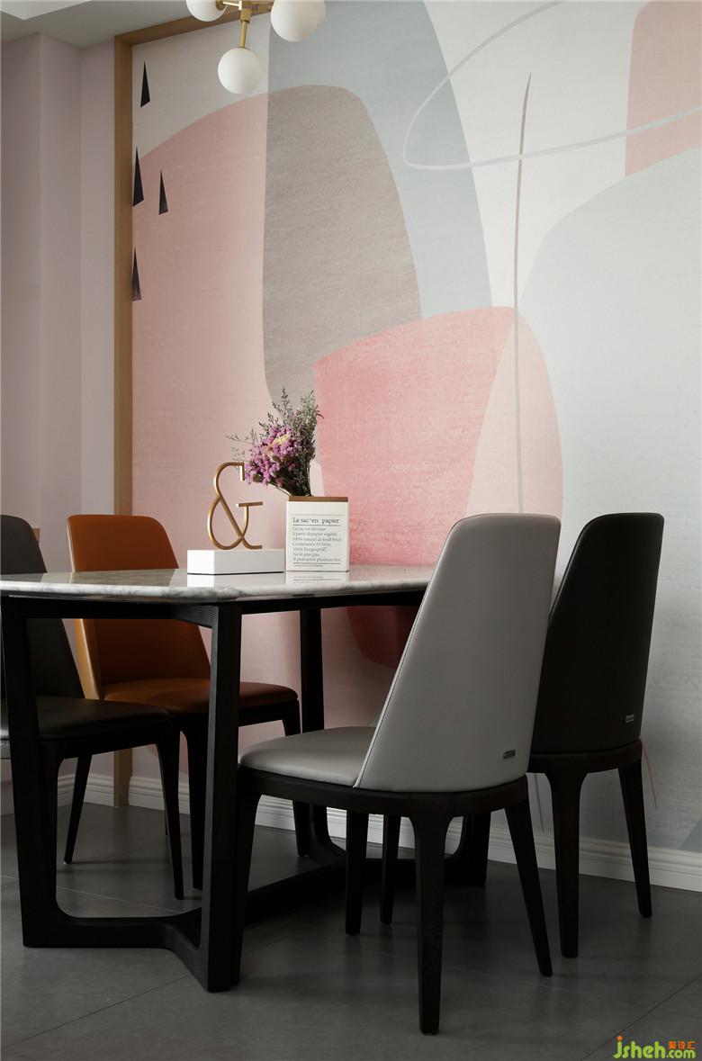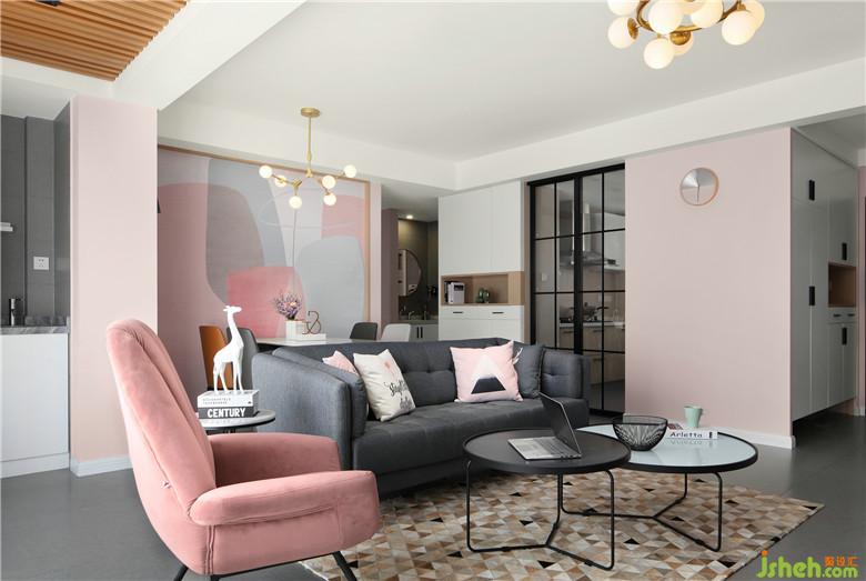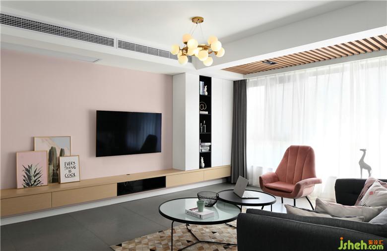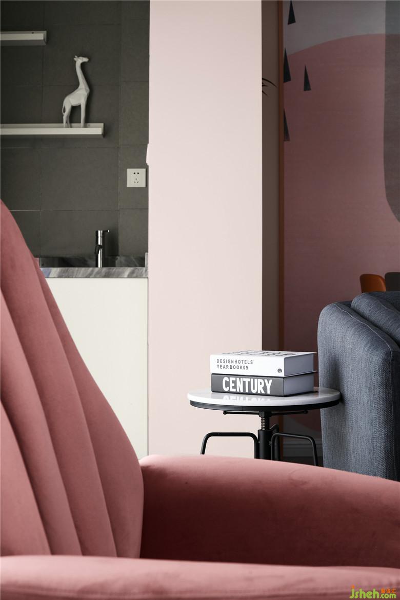 ▲在這個(gè)以粉色為基調(diào)的空間里,從大面積的墻體背景,到單品的家具、靠枕、裝飾畫(huà),都不斷的呼應(yīng)著,而白色的定制柜與深灰色沙發(fā),則起到了一個(gè)很好平衡作用。
