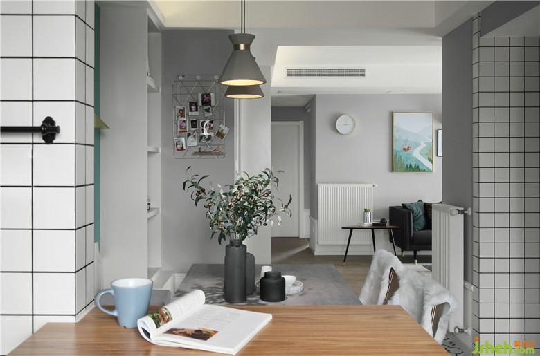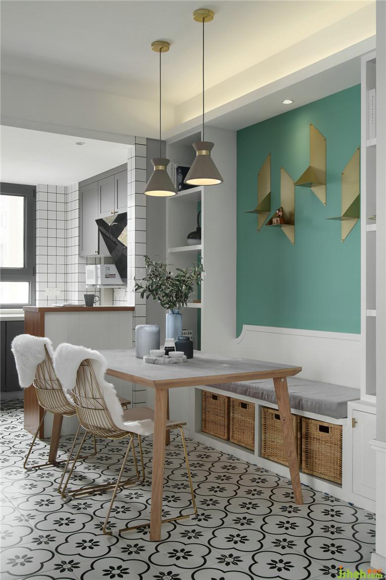▲餐廳室內(nèi)設(shè)計師利用卡座形式,是能夠滿足多人用餐并且具有收納功能,同時又不失空間上的設(shè)計美感。滿足屋主需求在廚房與餐廳之間增設(shè)吧臺,也是作為兩個功能區(qū)之間的過渡與隔斷。餐廳、廚房區(qū)域以花磚進(jìn)行鋪貼,在這片以純色為主的空間中,結(jié)合造型簡潔的木質(zhì)餐桌搭配金屬餐椅,讓空間更具變化性及層次感。