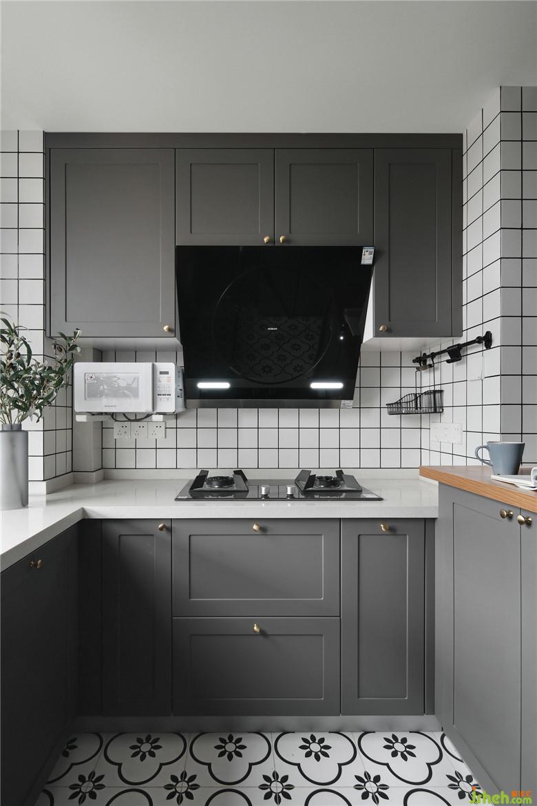 ▲室內(nèi)設(shè)計師為了使空間更為通透、寬敞,打掉了原戶型的廚房墻體,定制的櫥柜在顏色運用上搭配整體空間,開放式廚房在布局上和諧統(tǒng)一,延伸視覺感。