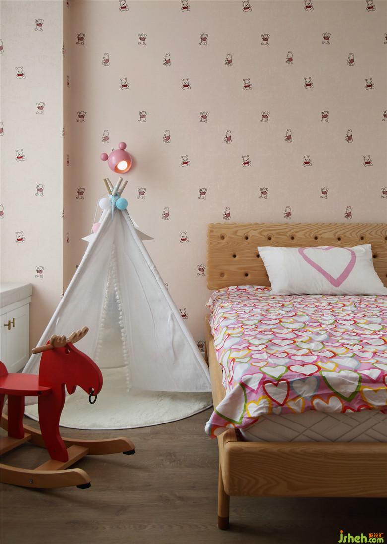 ▲女兒房選用了粉色的維尼熊墻紙,很是可愛了。盡可能給孩子一些玩耍空間,小帳篷、小木馬和墻上的米奇頭壁燈,體現(xiàn)了兒童房的活潑性。