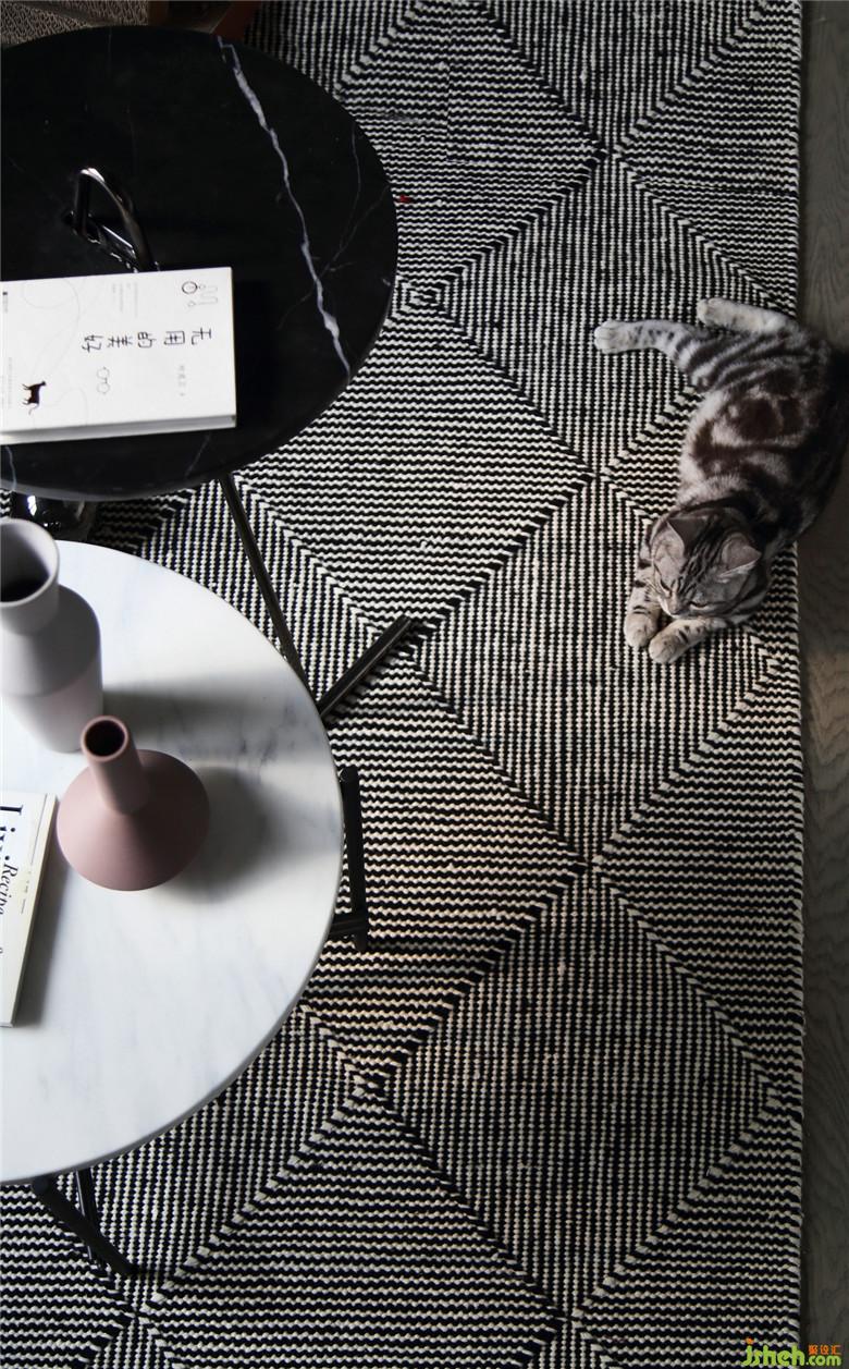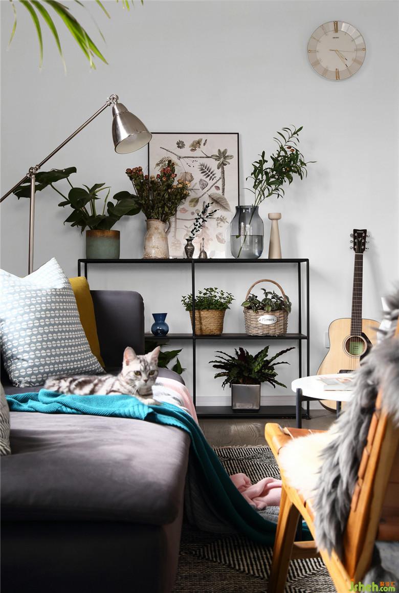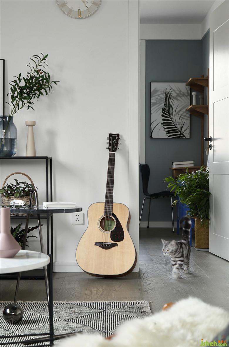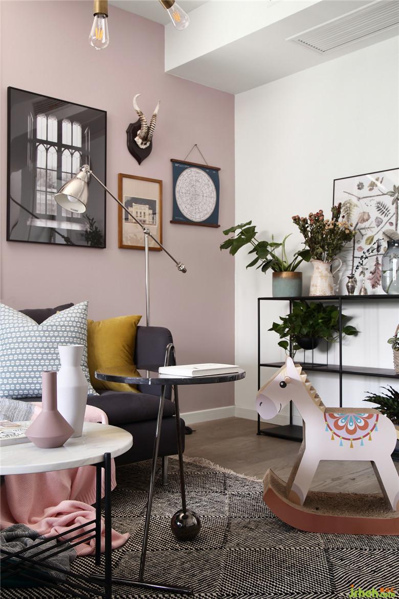▲在這個面積并不開闊的空間里,室內(nèi)設(shè)計師將不同的元素進(jìn)行著比對,而黑色金屬線條的置物架,不僅滿足了展示收納功能,也不顯得空間擁擠,恰到好處的交織出奇妙的平衡感。屋主夫婦的內(nèi)心一定是柔軟而充滿童趣的,粉色木馬仿佛回到了童年,彈著木吉他,有一只他和她的貓。