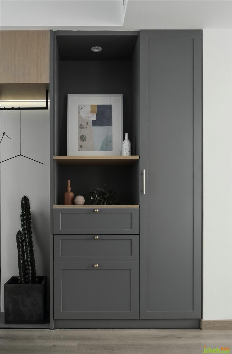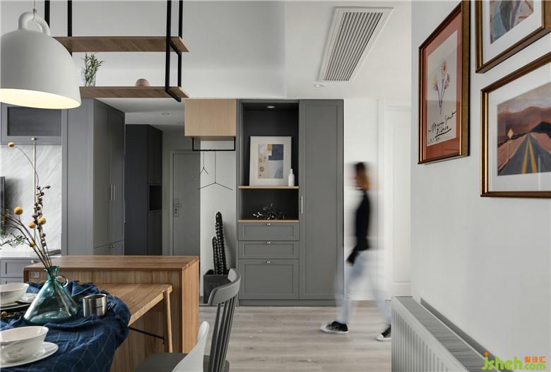 ▲從餐廳處看向入戶玄關(guān),淺灰色的收納柜與入戶鞋帽柜呼應(yīng)設(shè)計(jì),半開(kāi)放式的布局也是家中進(jìn)行展示的巧妙位置。原本柜體這塊有部分隔墻,造成了從入戶看向客餐廳阻擋視線的弊端,而室內(nèi)設(shè)計(jì)師將隔墻打掉,同時(shí)為了擴(kuò)大主衛(wèi)空間,將主衛(wèi)墻體向外推,最終留出收納柜的深度。收納柜頂部的木色塊體底部?jī)?nèi)嵌了燈管,下方設(shè)置了一個(gè)置衣架,這樣不僅使空間通透不阻擋視線,也方便于回家后外套的放置。