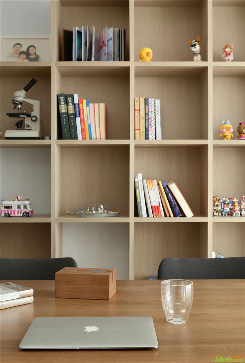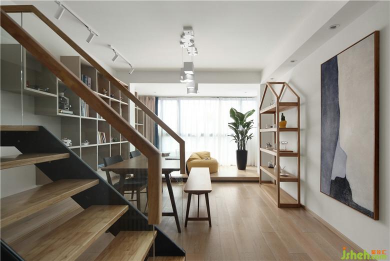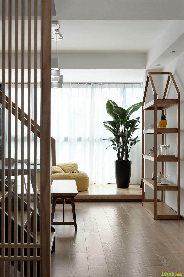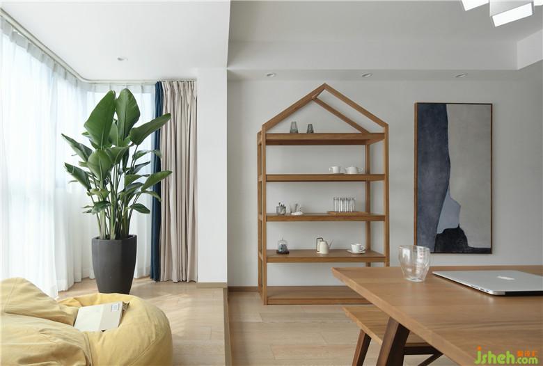 ▲原先的陽臺形式拋棄掉,室內(nèi)設(shè)計師將這塊區(qū)域融入整個學(xué)習(xí)休閑區(qū),增加了使用空間的同時,也使陽光充分的灑落這片區(qū)域,搭配著腔調(diào)感滿滿的裝飾畫,閑暇時一家人席地而坐,讀書做游戲。是的,生活需要儀式感,需要自由式空間。而開放式的布局令光線、空氣、甚至是映射進(jìn)室內(nèi)的綠植都成為了貫穿功能區(qū)的線索,純凈的白色調(diào),天然的木元素,整個空間顯得輕盈而靈動。