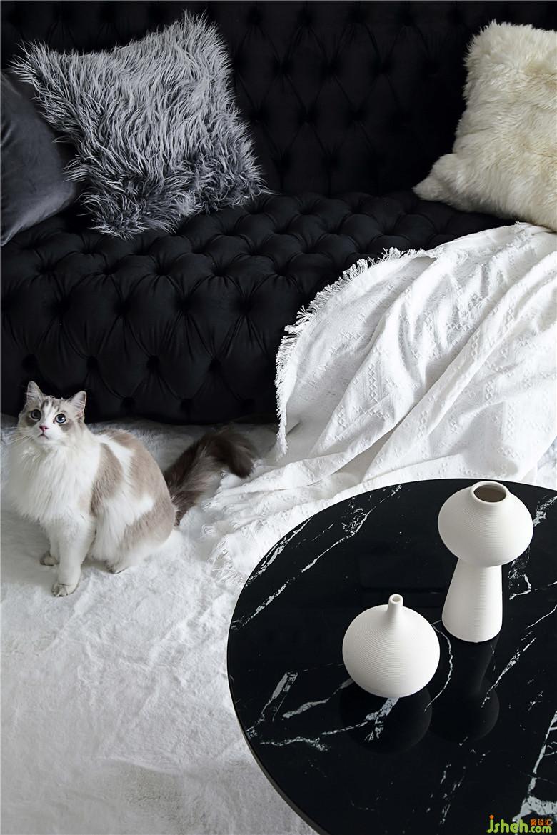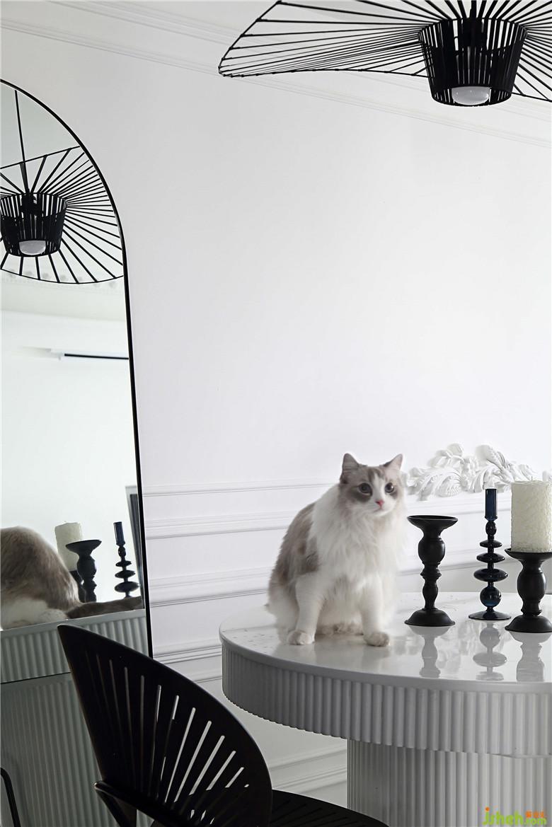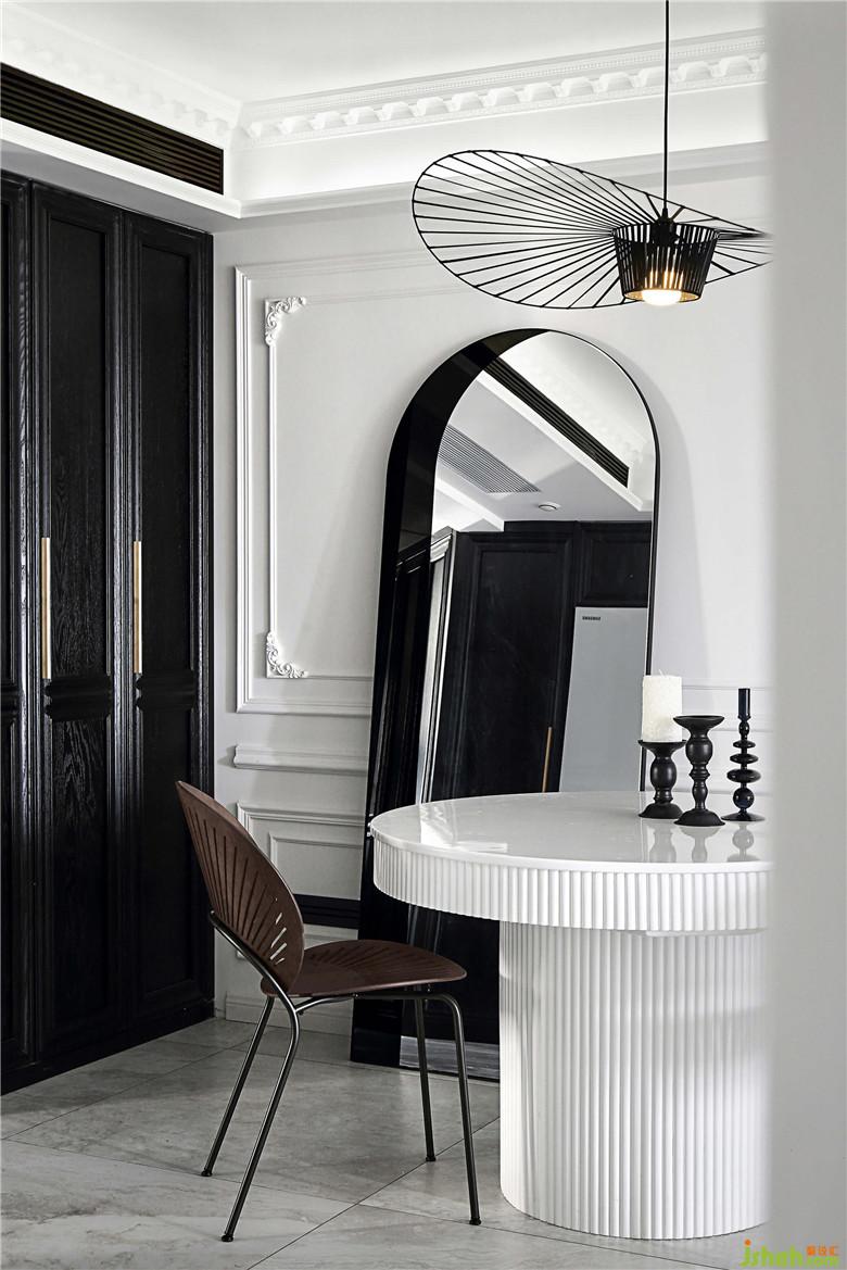 餐廳的墻面一面是黑色柜體的收納空間,另一面是連著客廳部分的回形線條白墻,黑白的搭配視覺感十分鮮明??繅Χ⒌墓伴T形的鏡子,產(chǎn)生奇妙的穿越感,好像可以穿過鏡子走到另一面。造型別致的草帽吊燈和孔雀椅雖然顏色上并不亮眼,夜晚開燈的時(shí)候會(huì)投下好看的光影,室內(nèi)設(shè)計(jì)師讓餐廳的黑白空間之中線條層次更具節(jié)奏,給人一種文藝電影的即視感。