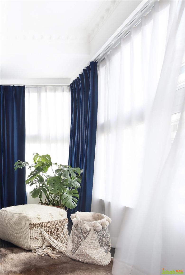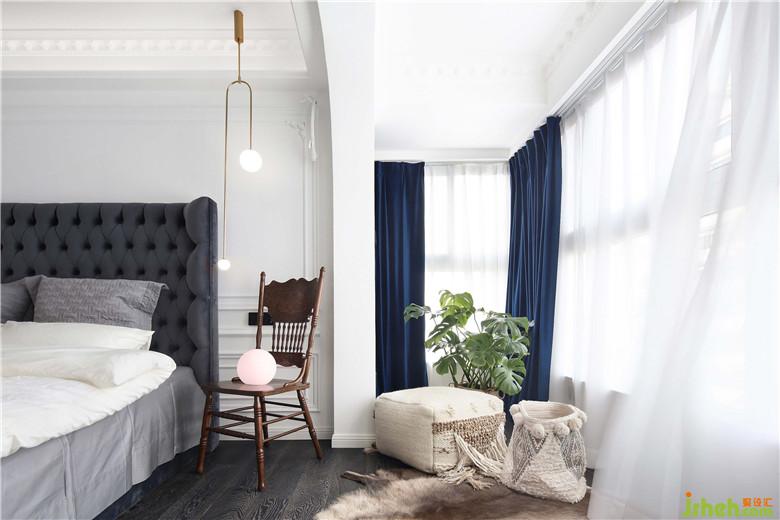 主臥的陽臺作休閑用途,地毯、靠墊和懶人沙發(fā)組成輕松的一角。深藍色絲絨窗簾是復(fù)古優(yōu)雅的外國電影中的印象,沉靜且耐看。一個造型別致、古董樣式的靠背椅當(dāng)做床頭柜也很有趣,只要你喜歡,合不合規(guī)矩都不要緊。