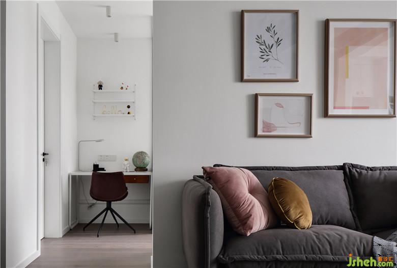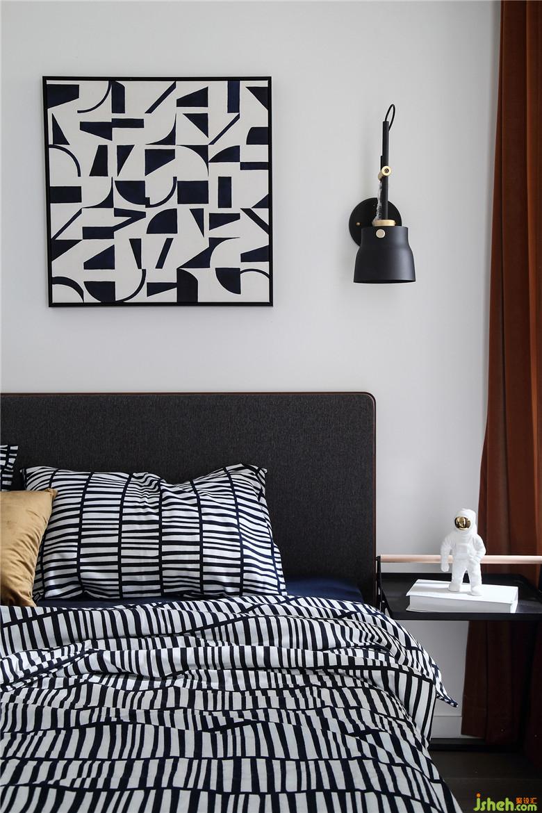 原戶型次臥面積過(guò)小,室內(nèi)設(shè)計(jì)師將原餐廳區(qū)域規(guī)劃為次臥,擴(kuò)大了次臥面積。次臥的風(fēng)格是與主臥截然不同的,黑白的床品和裝飾畫(huà)使屋子酷起來(lái),床頭柜上的擺件與整個(gè)空間一起生出流行藝術(shù)氛圍。