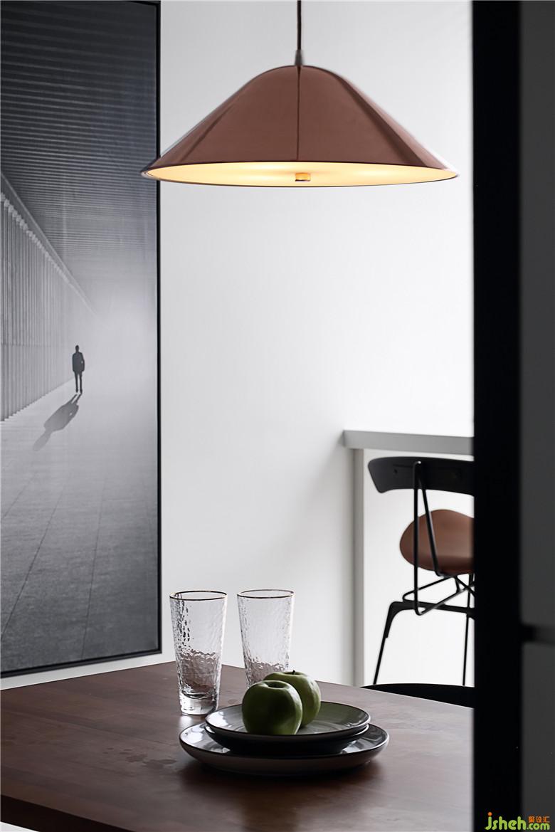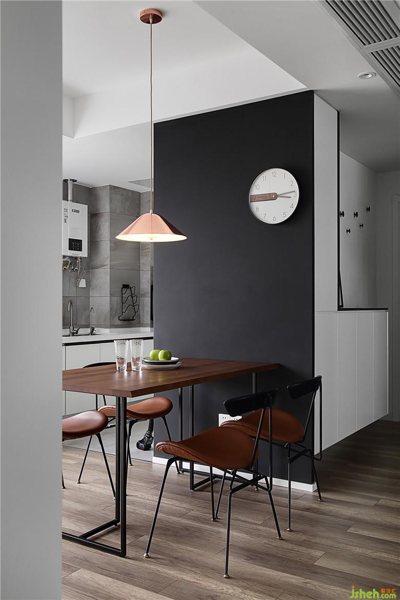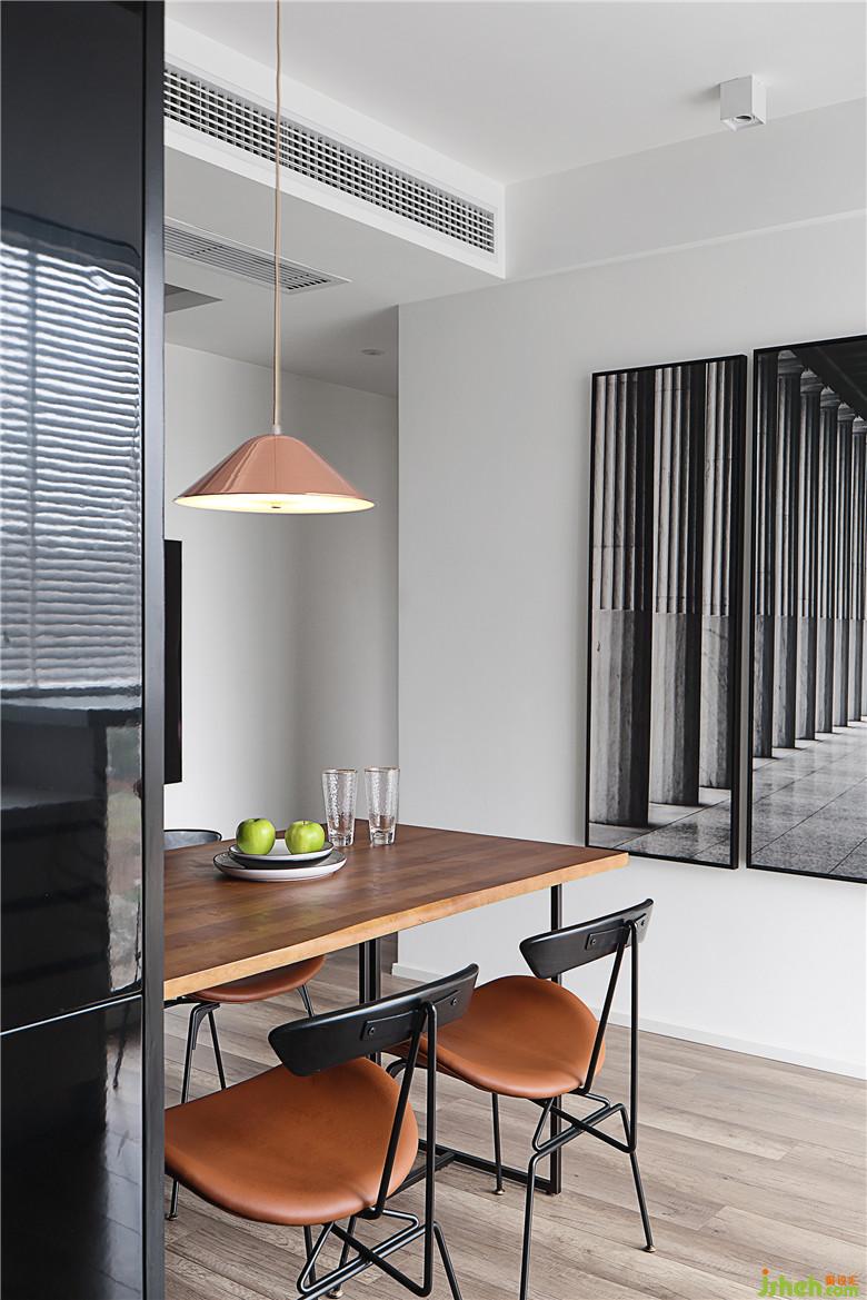 ▲餐廳兩側(cè)的墻面一黑一白,黑白之中又點(diǎn)綴白黑,互相對(duì)立又互相融合,簡(jiǎn)約的風(fēng)格下沉淀質(zhì)感,室內(nèi)設(shè)計(jì)師讓餐廳的光線更趨于柔和。loft風(fēng)格的餐桌是胡桃木與鐵藝的結(jié)合,餐椅是皮質(zhì)結(jié)合鐵藝,不厚重卻仍有鋒芒。玫瑰金的吊燈,小小一盞卻可以在黑白的空間中點(diǎn)亮溫馨。