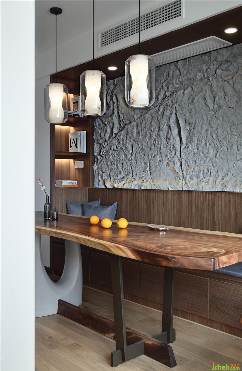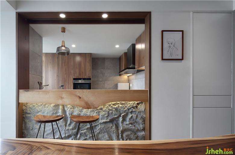 餐廳與廚房相鄰的一側(cè)做了半開放式與吧臺(tái)結(jié)合的設(shè)計(jì),室內(nèi)設(shè)計(jì)師用餐空間得到了提升也豐富了用餐形式。木質(zhì)的吧臺(tái)臺(tái)面下緣并不平整,連接仿真石材的裝飾與卡座部分的墻面呼應(yīng)。