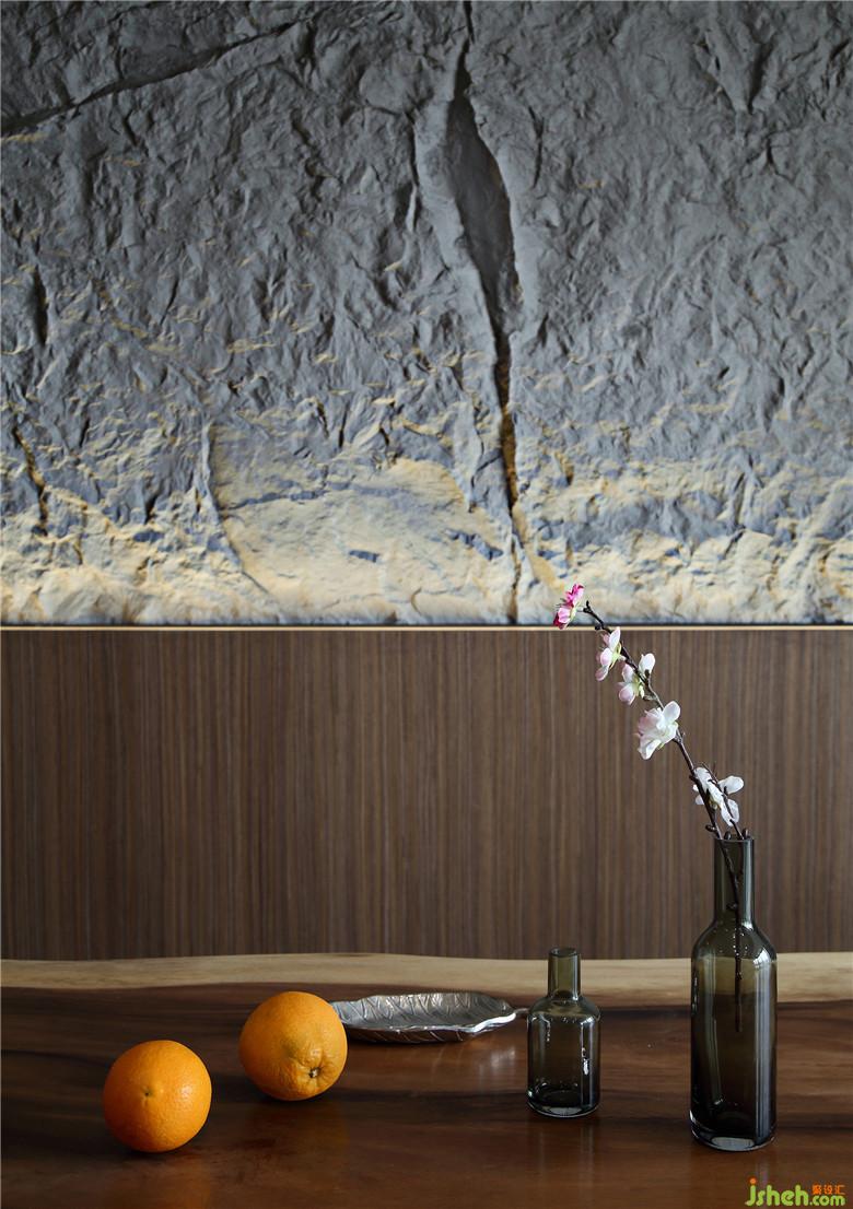 餐廳背景墻望去是極樸素的巖石形態(tài),與四周的胡桃木色相配,散發(fā)著沉靜的氣息。設(shè)計(jì)實(shí)現(xiàn)的過程,不同的材料的組合,玻璃纖維塑造巖石的紋理、起伏,石粉覆蓋,點(diǎn)綴在屋間便是天然去雕飾的氣息。內(nèi)嵌的燈帶光線并不搶眼,是十分和諧的裝飾與背景墻融為一體。