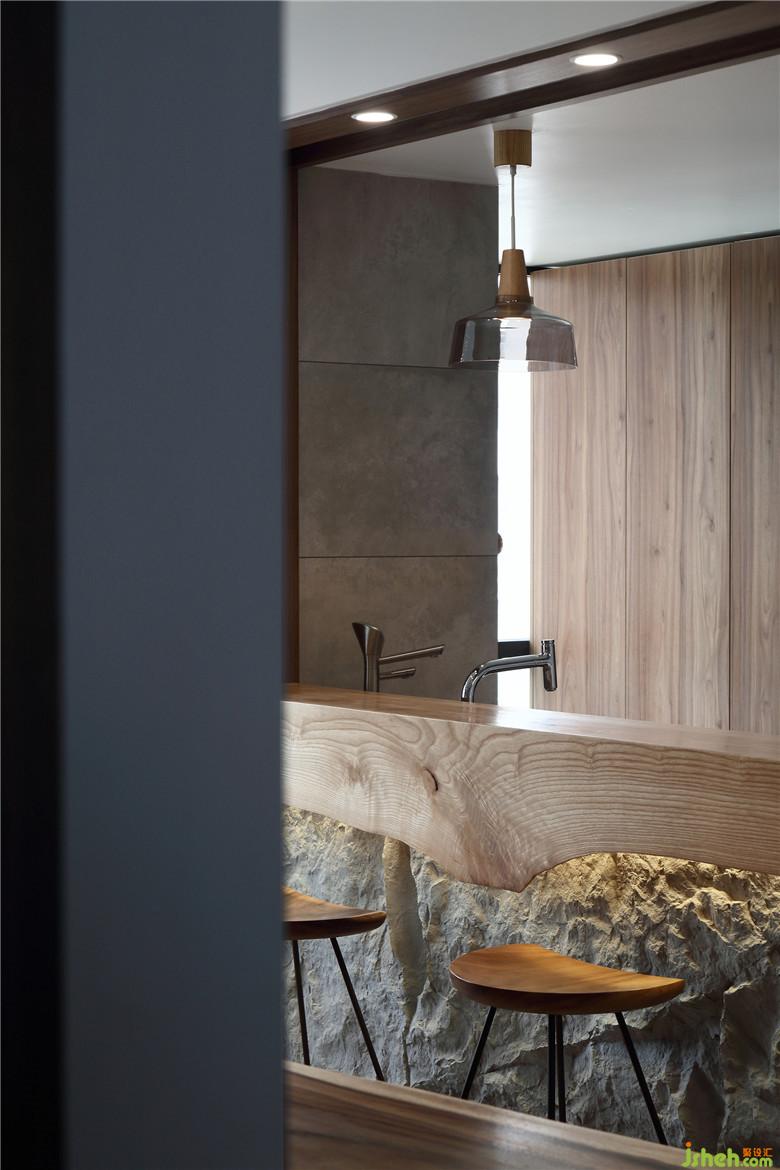 天然材質(zhì)的紋理像寫意的白描。(男主人最喜歡休閑一角,小酌的標(biāo)配吧臺(tái)。)