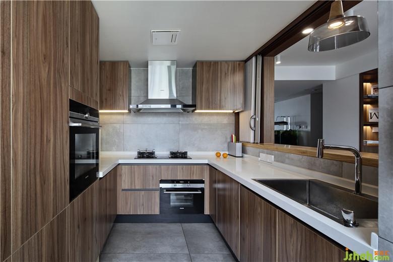 廚房三面皆有櫥柜,收納功能齊全。做煙火氣稍多的中餐時(shí)廚房和餐廳也有軟簾可以開放隔離,生活方式的多種選擇,也是這個(gè)家的包容所在。