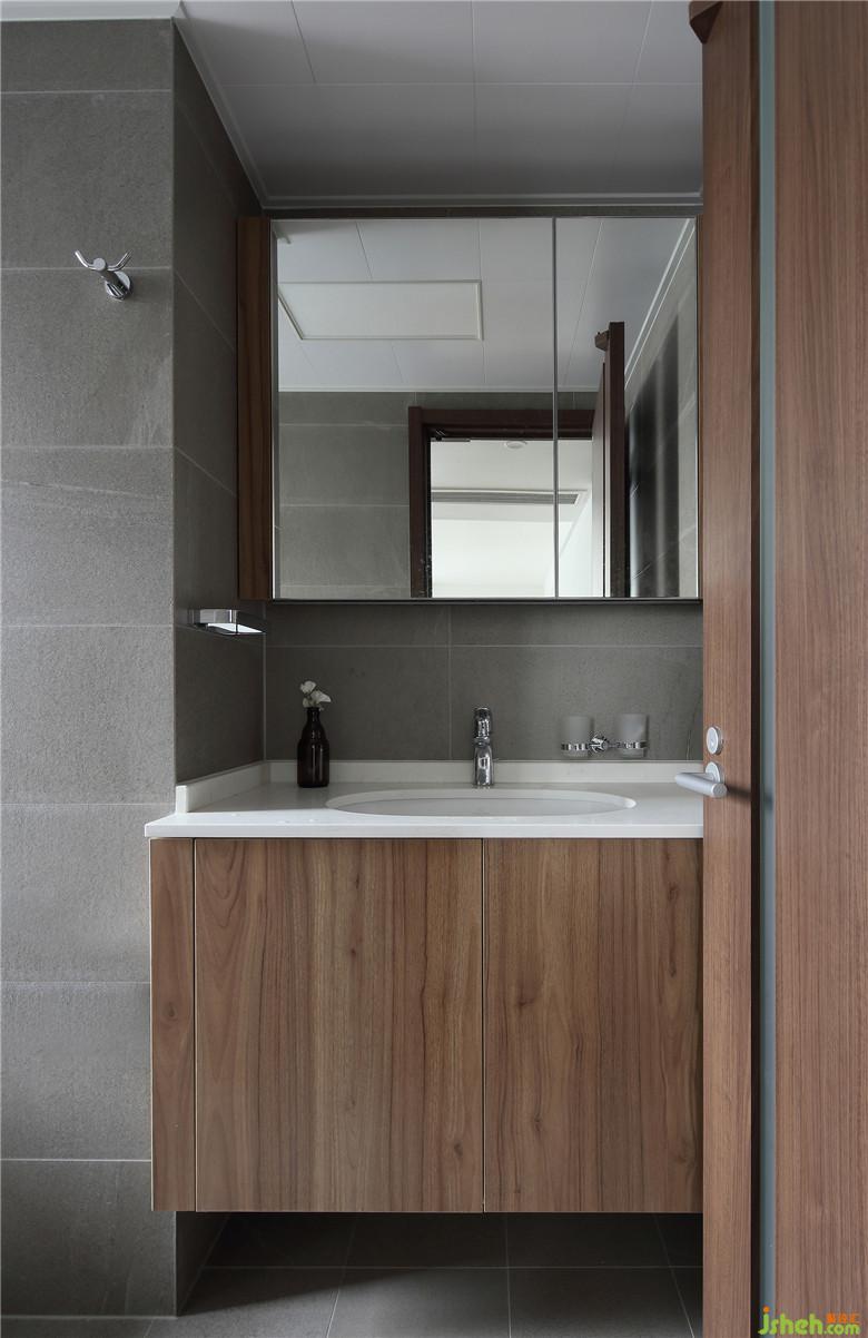 灰色的墻磚與臺(tái)盆柜的木色相映,衛(wèi)生間就應(yīng)該是這樣潔凈、簡(jiǎn)約。