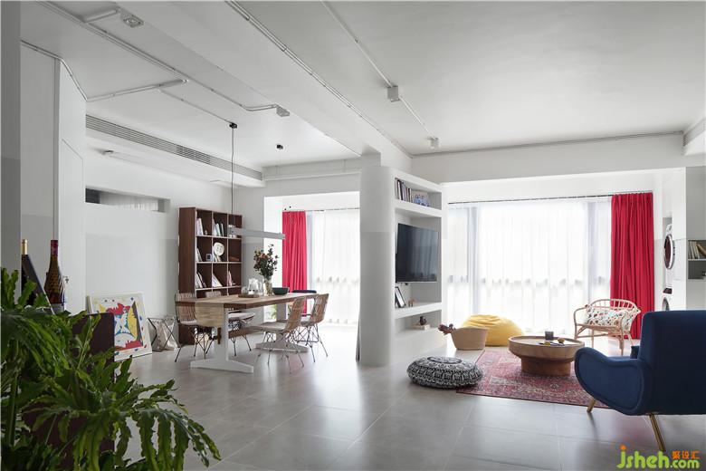 客廳與餐廳全覽。家中并沒有選擇地板,顏色清淡帶著內(nèi)斂光澤的地磚可以讓色彩濃郁的裝飾物更好的被映襯出來。