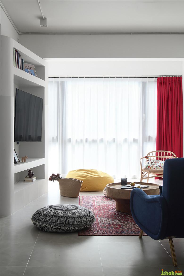 設(shè)計(jì)師將承重窄墻改造為電視背景墻,內(nèi)嵌式的電視機(jī)以及雜物收納消除墻面平整帶來的刻板感。一側(cè)的弧面造型為視野增加延伸感。