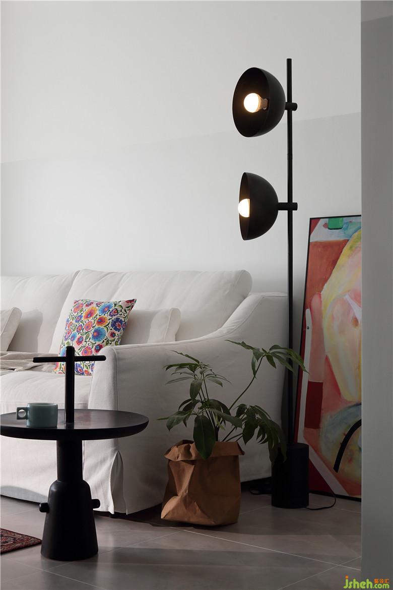 白色布藝沙發(fā)點(diǎn)綴印花靠墊,簡約的路燈沉默的站在一旁挨著一副色彩絢麗的畫作,是十分有節(jié)奏感的沙發(fā)一角。