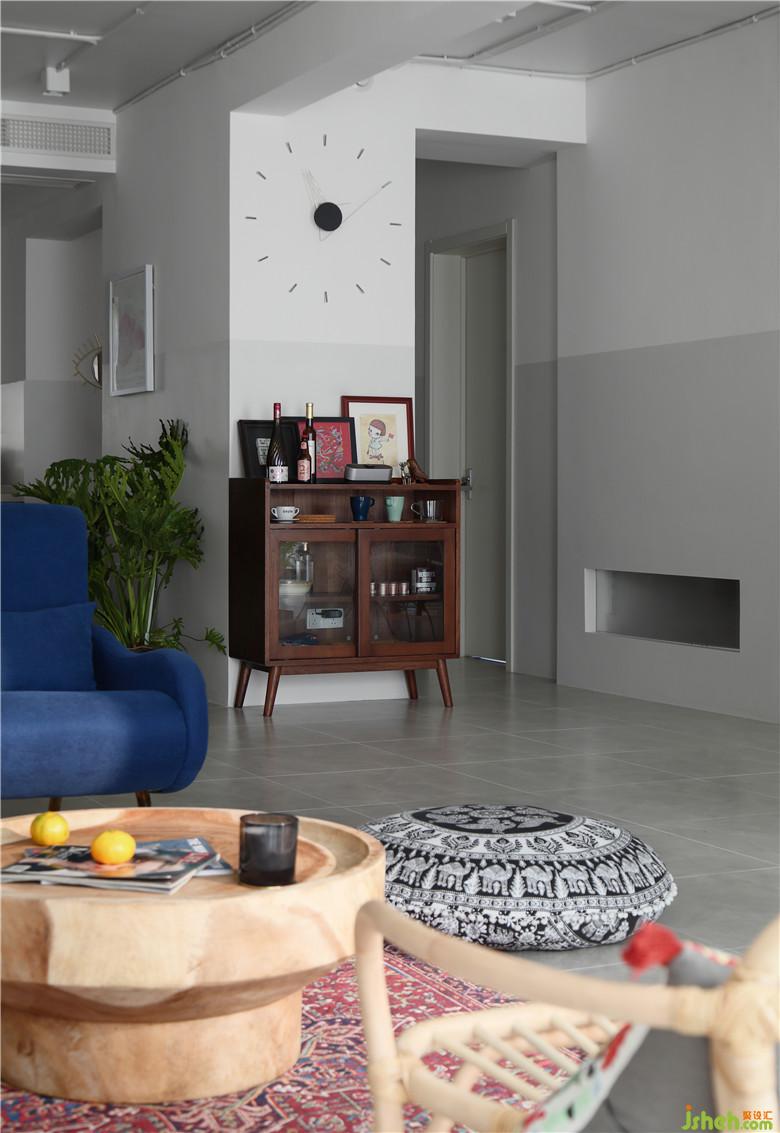 從客廳望向臥室區(qū)域,依靠承重墻擺放了造型別致的小斗柜,收藏的是業(yè)主累積的各式物品,除了可以娓娓道來的來歷也讓開闊的空間更具生活氣息。